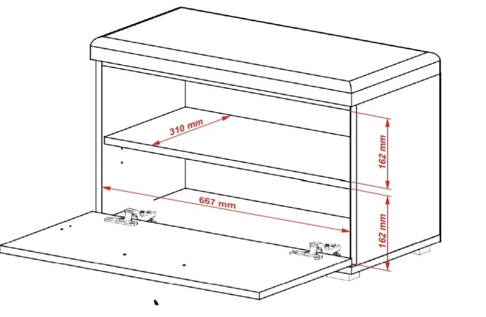 Ett fint med en modern design. Skoskåpets design gör så att den lätt kan ersätta skohyllan genom att gömma undan skorna för mer plats, samt med den praktiska och behagliga sittdynan. Själva skåpet är tillverkad i laminerad MFP (premium träskiva) med en högblank finish, och den är klädd med ett behagligt tyg med detaljer i kromad metall.