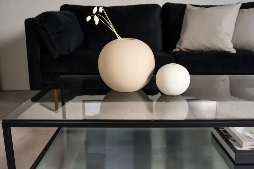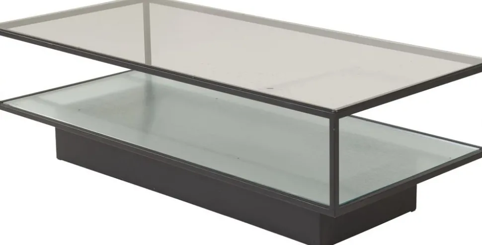 Soffbord med en svart konsoll av metall som bas, även stommen är av metall. Detta gör bordet robust och stadigt. Toppskiva och hyllplan av glas.
