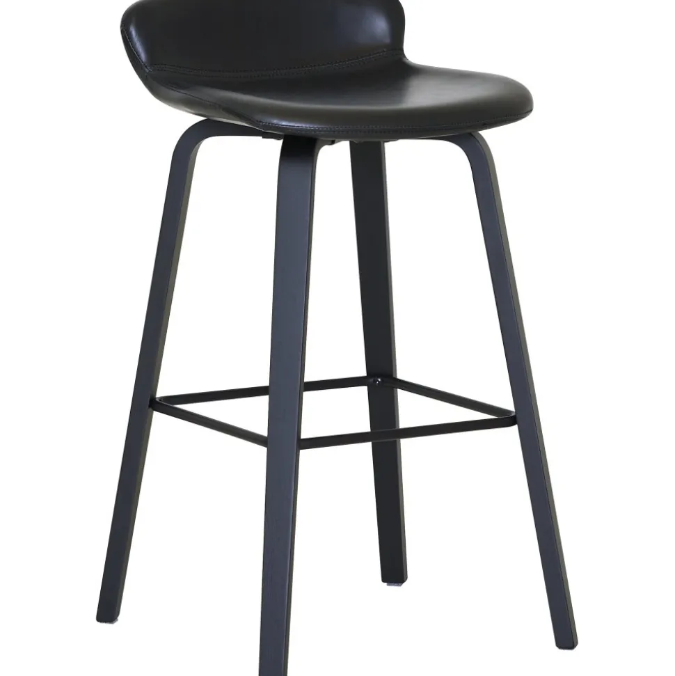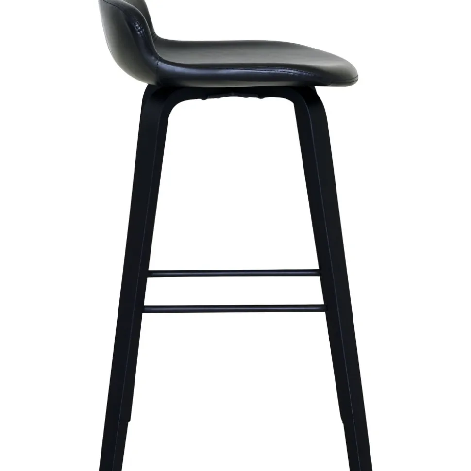 Barstol med svart PU-klädsel, svartlackade träben och metallfotstöd.
