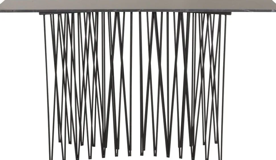 Konsolbord med ett karaktäristiskt underrede av svart metall och svart toppskiva i stenmaterial. Alborga serie innehåller även soffbord i samma stil.