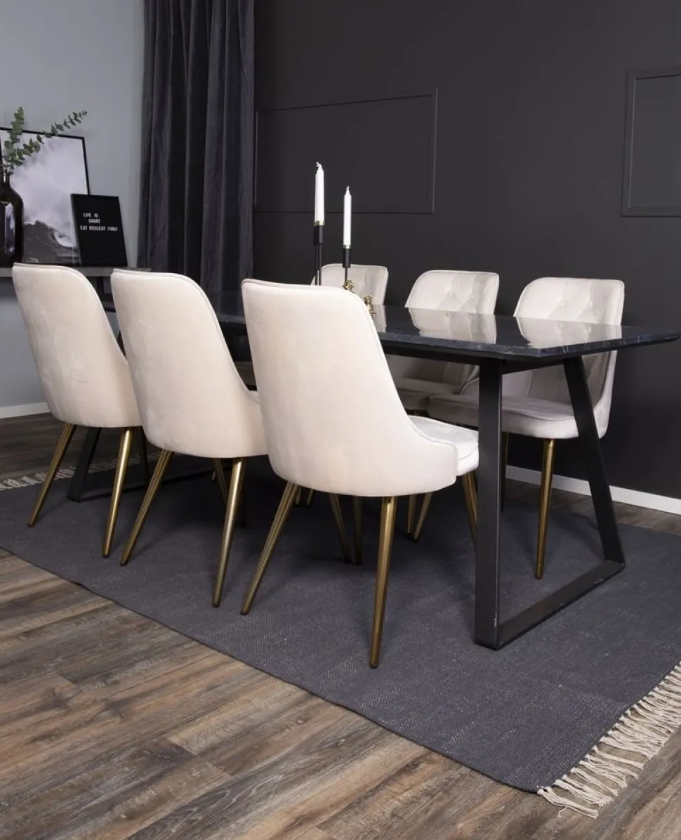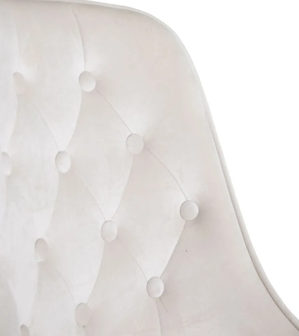 Modern i beige sammet, 100% polyester. Benen är av mässingsfärgad metall.