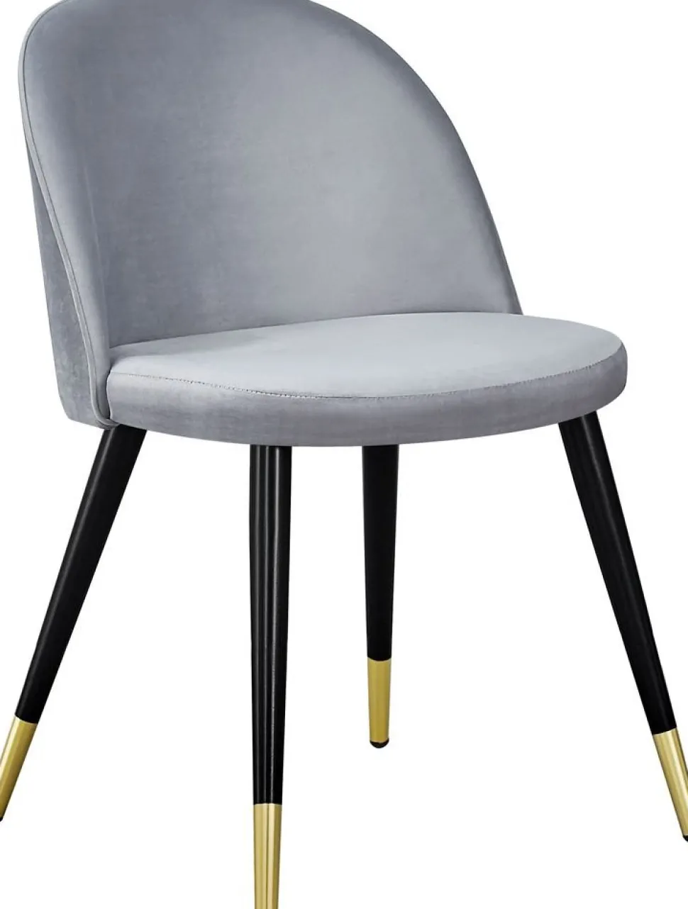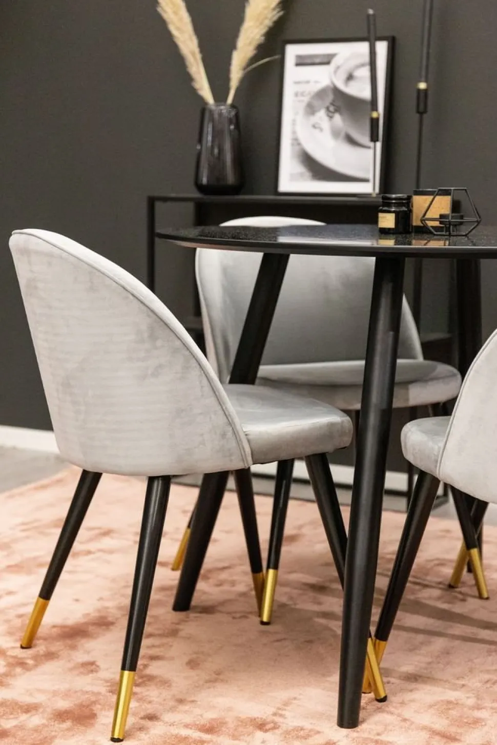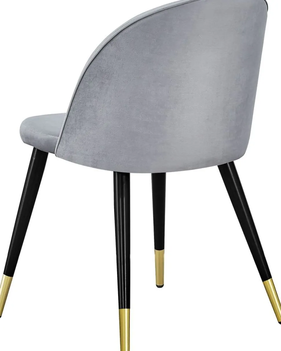Matstol klädd med grått tyg, 100% polyester. Sits- och rygg är skumstoppad för god komfort. Ben i svart metall med mässingsdetaljer nertill.