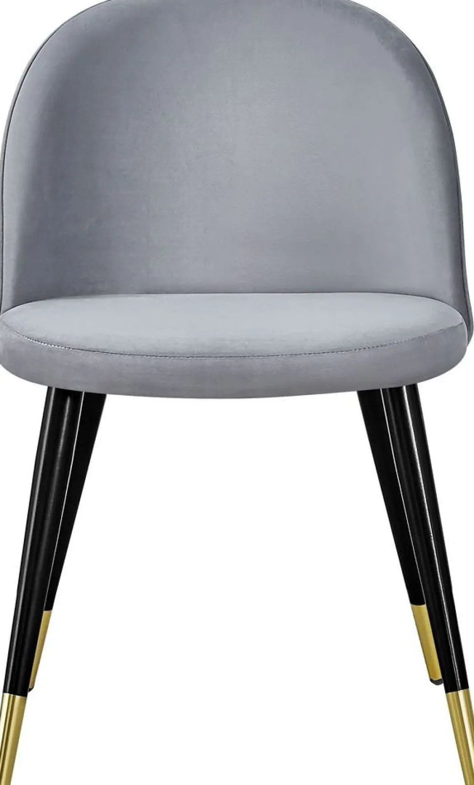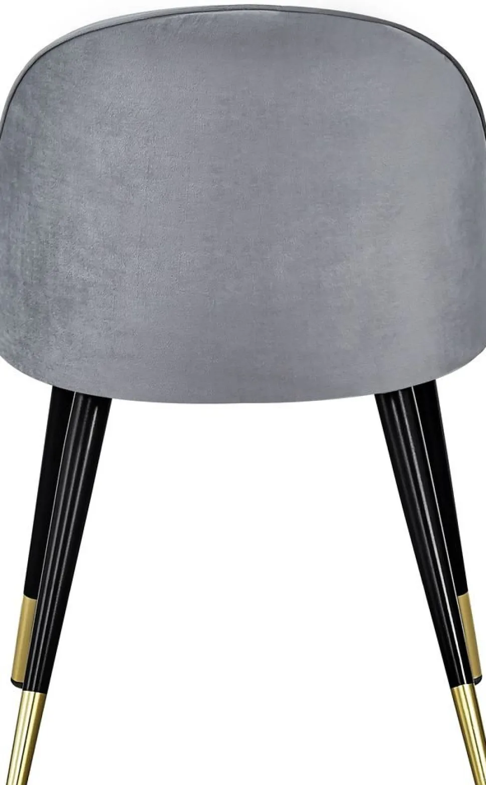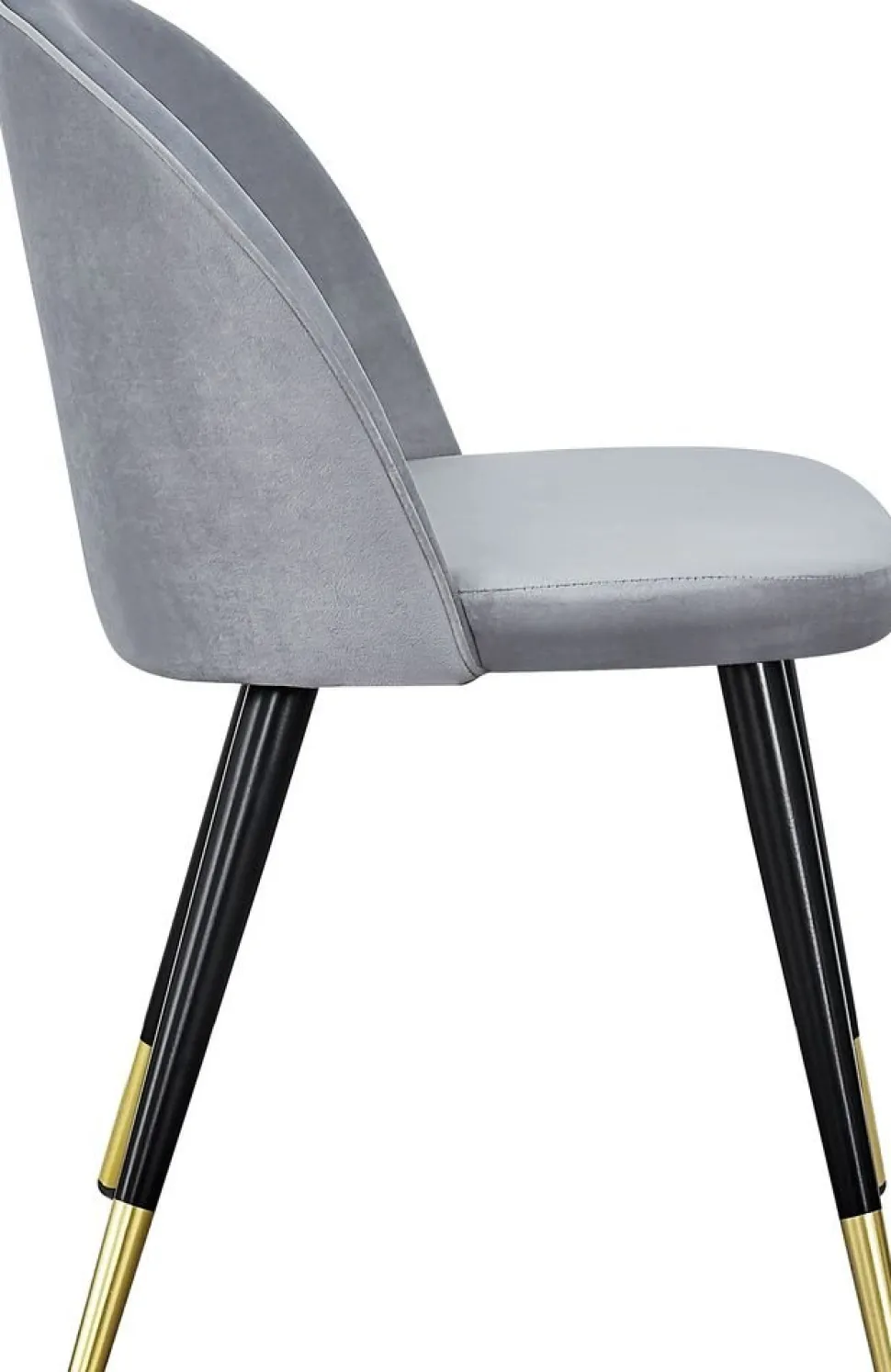 Matstol klädd med grått tyg, 100% polyester. Sits- och rygg är skumstoppad för god komfort. Ben i svart metall med mässingsdetaljer nertill.
