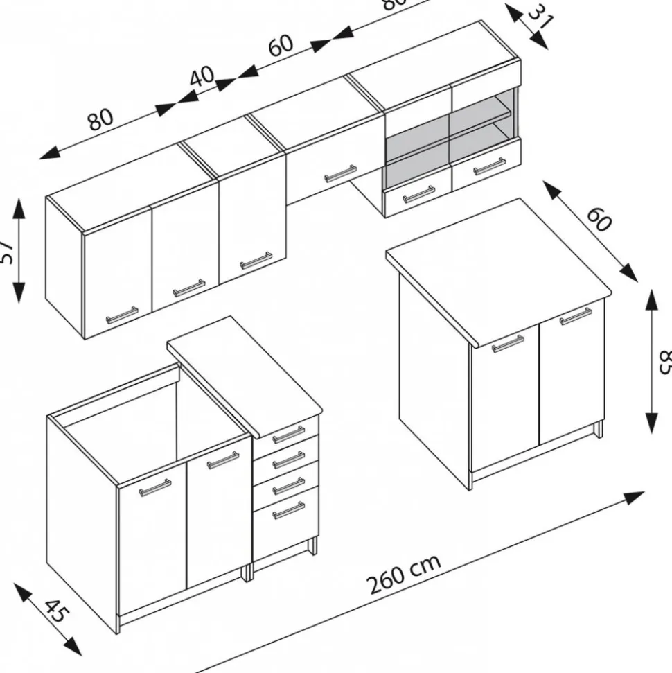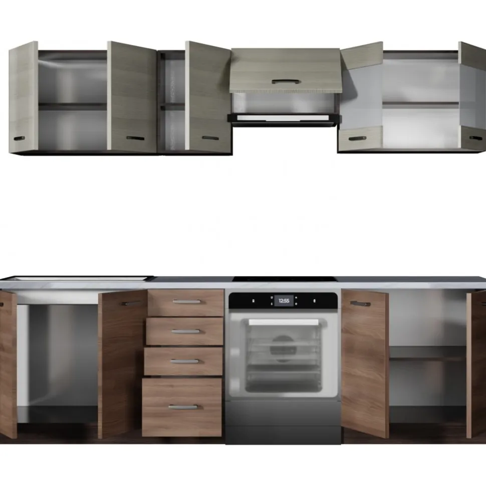 kombinerar traditionell charm med en sofistikerad blandning av mörkbrun och navara ek, wenge och granit. Med en total längd på 260 cm erbjuder detta både funktion och stil, med gott om förvaringsutrymme och arbetsyta som passar både för vardagsbruk och för mer omfattande matlagning. De eleganta färgerna och materialen skapar ett tidlöst och inbjudande kök.