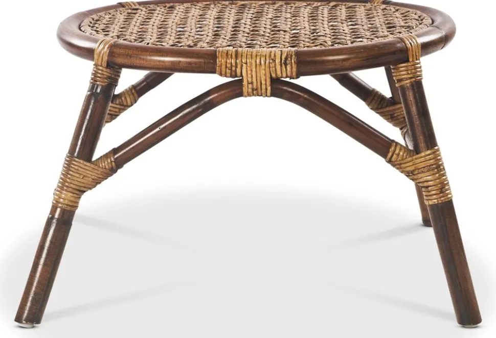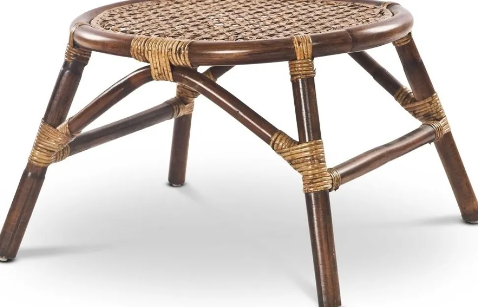Fotpall med stomme av brun rotting, flätad sits i brunt. Passar utmärkt till fåtöljerna i samma serie.