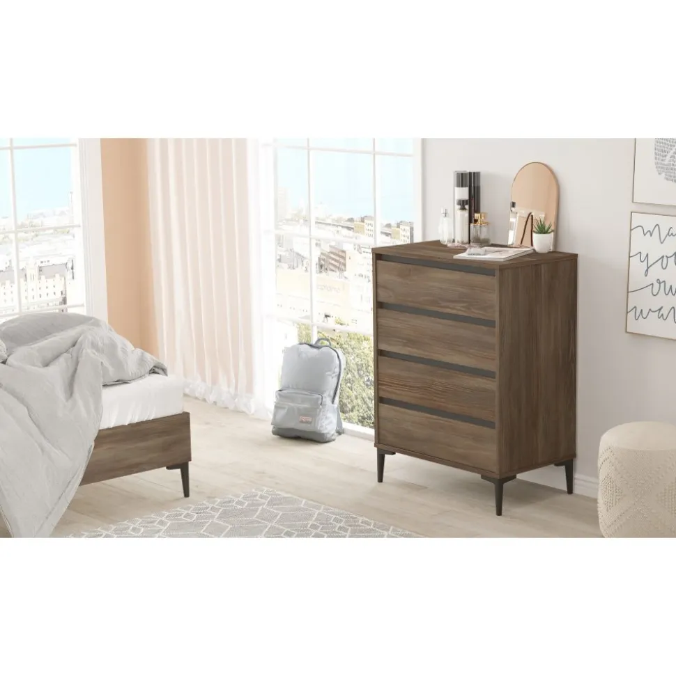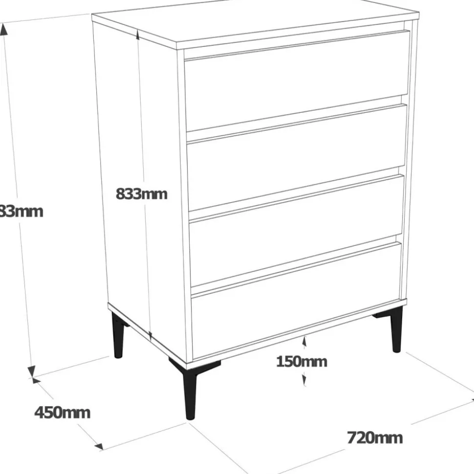 Byrå av melaminbelagd spånskiva. Ben av plast.