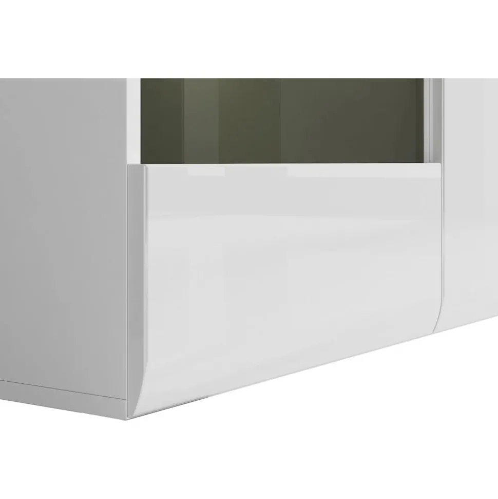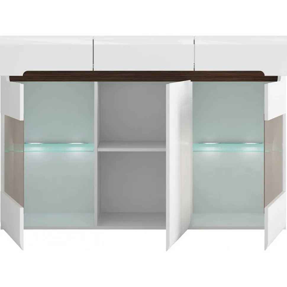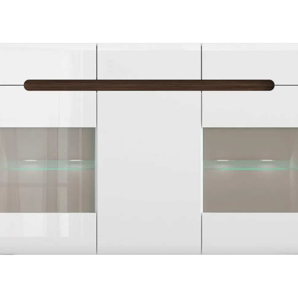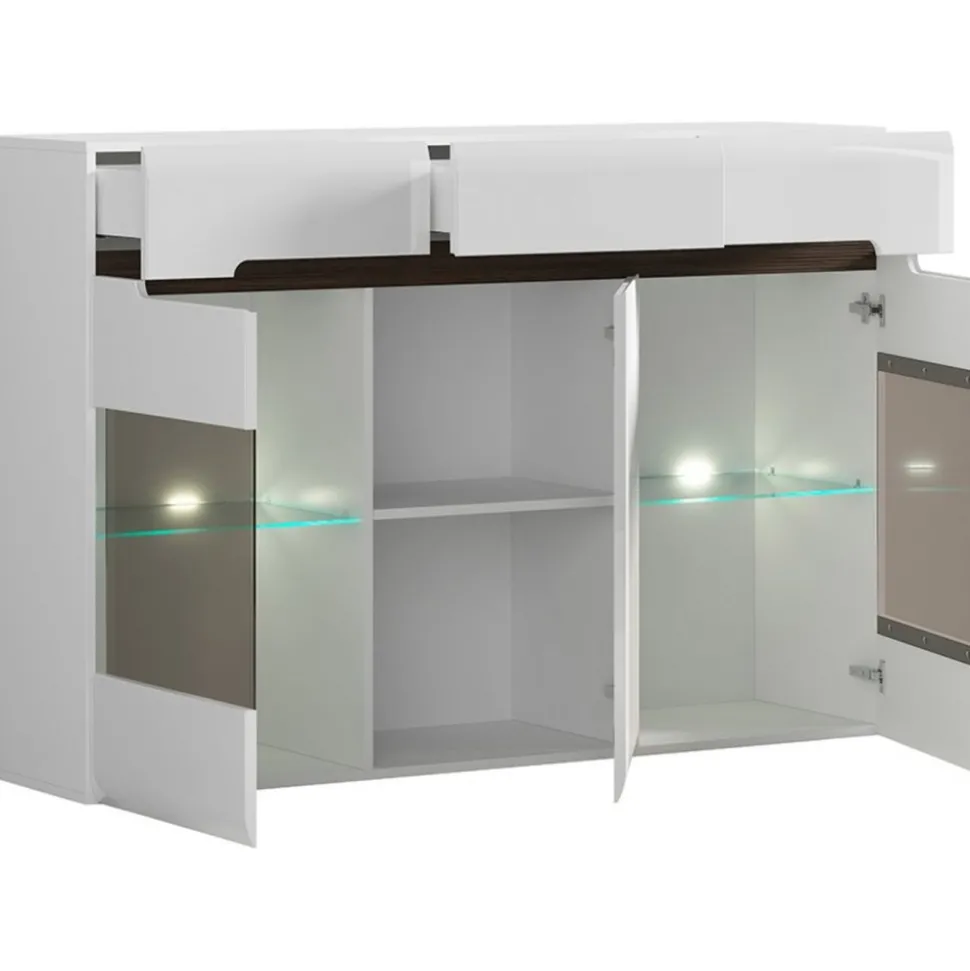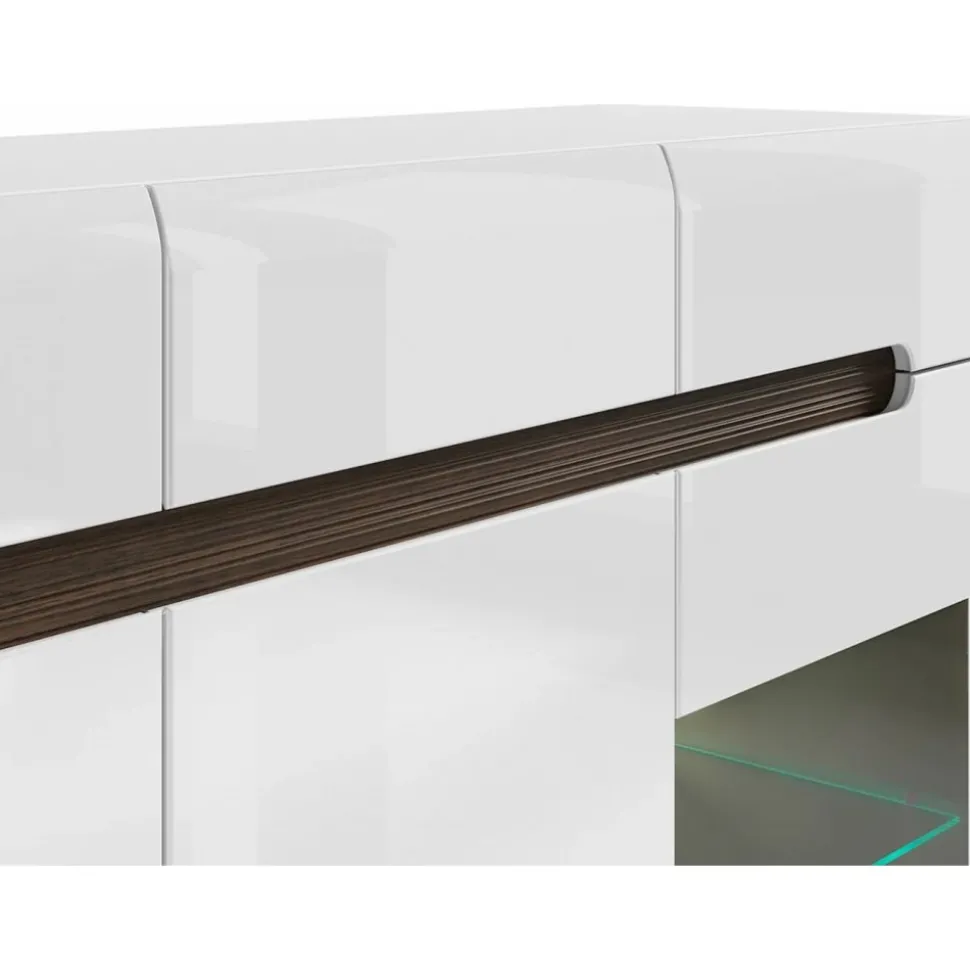 Skänk av trä med inbyggd LED-belysning. Med medföljande strips kan man välja färg på öppningen (vit, svart eller wenge).