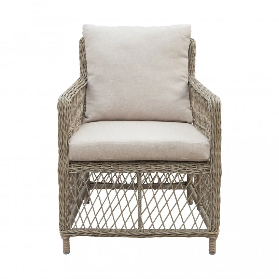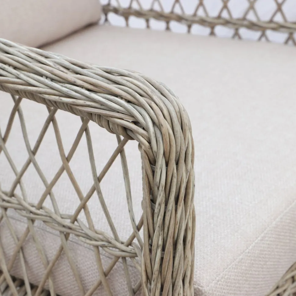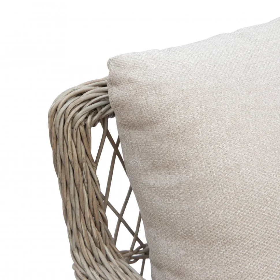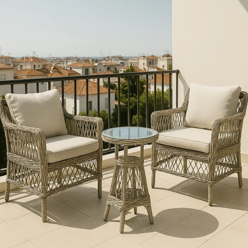 Gränna balkongset bestående av 2 st fåtöljer kompletta med rygg och sittdynor samt ett matchande sidobord. Naturfärgad konstrotting och beige kvalitetstyg på 230gram. Stomme i aluminium för att hålla i många år. Bordet med toppskiva av tempererat glas.