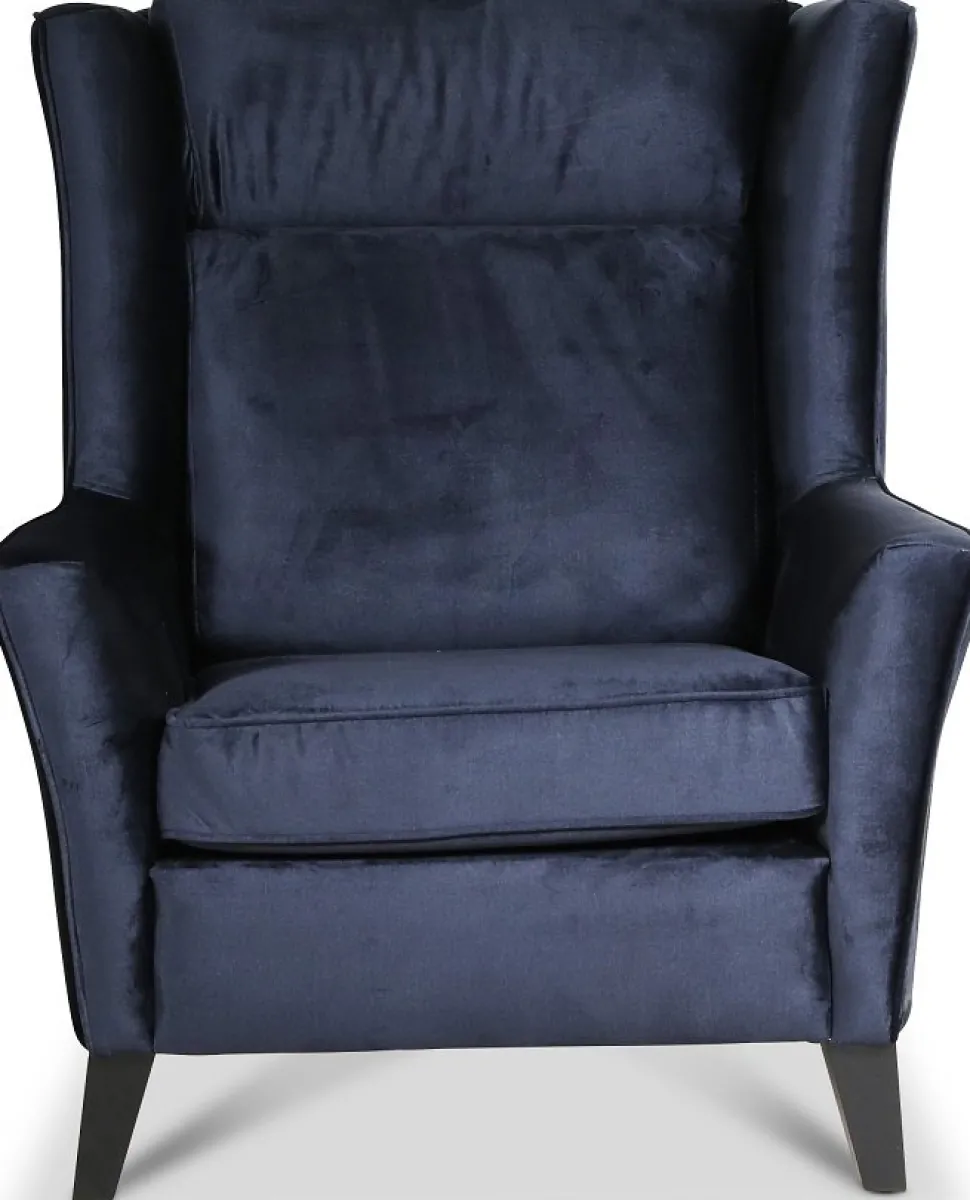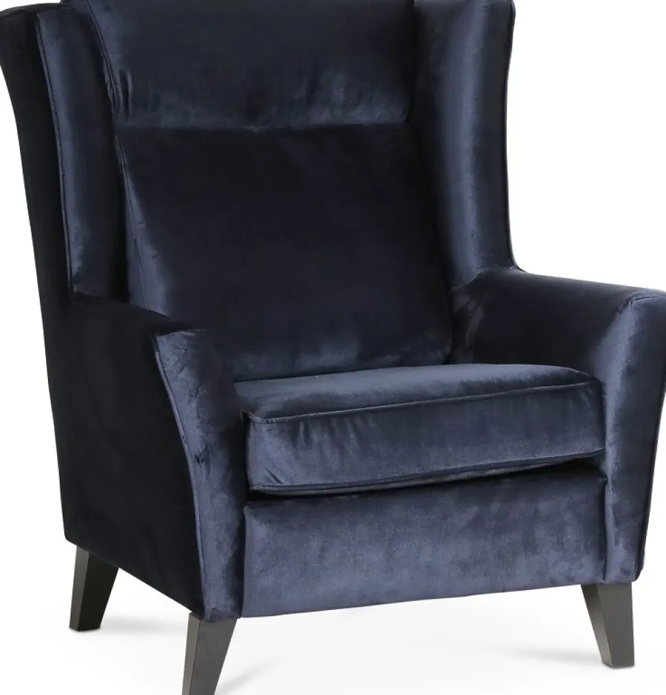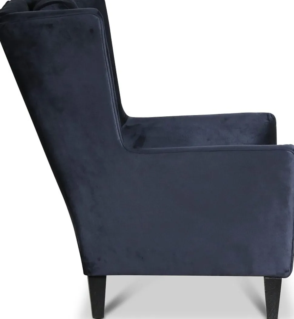 Berta klassisk öronlapsfåtölj i ett mörkblått tyg med sammetsutseende och känsla. Designen är både klassisk och retro. Svarta massiva träben. Skön sittkomfort med påkostad riktig kallskumstoppning för lång hållbarhet.