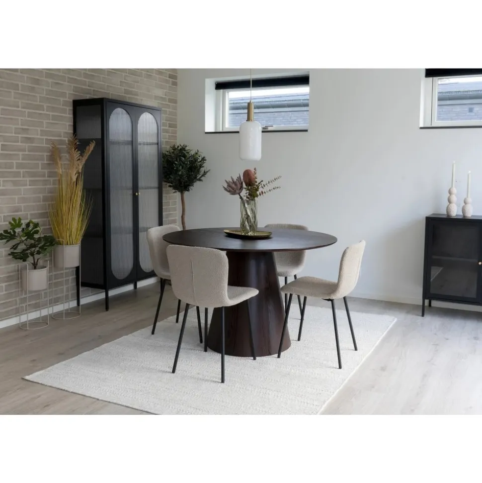 Runt av MDF och valnötsfanér. Levereras omonterad.