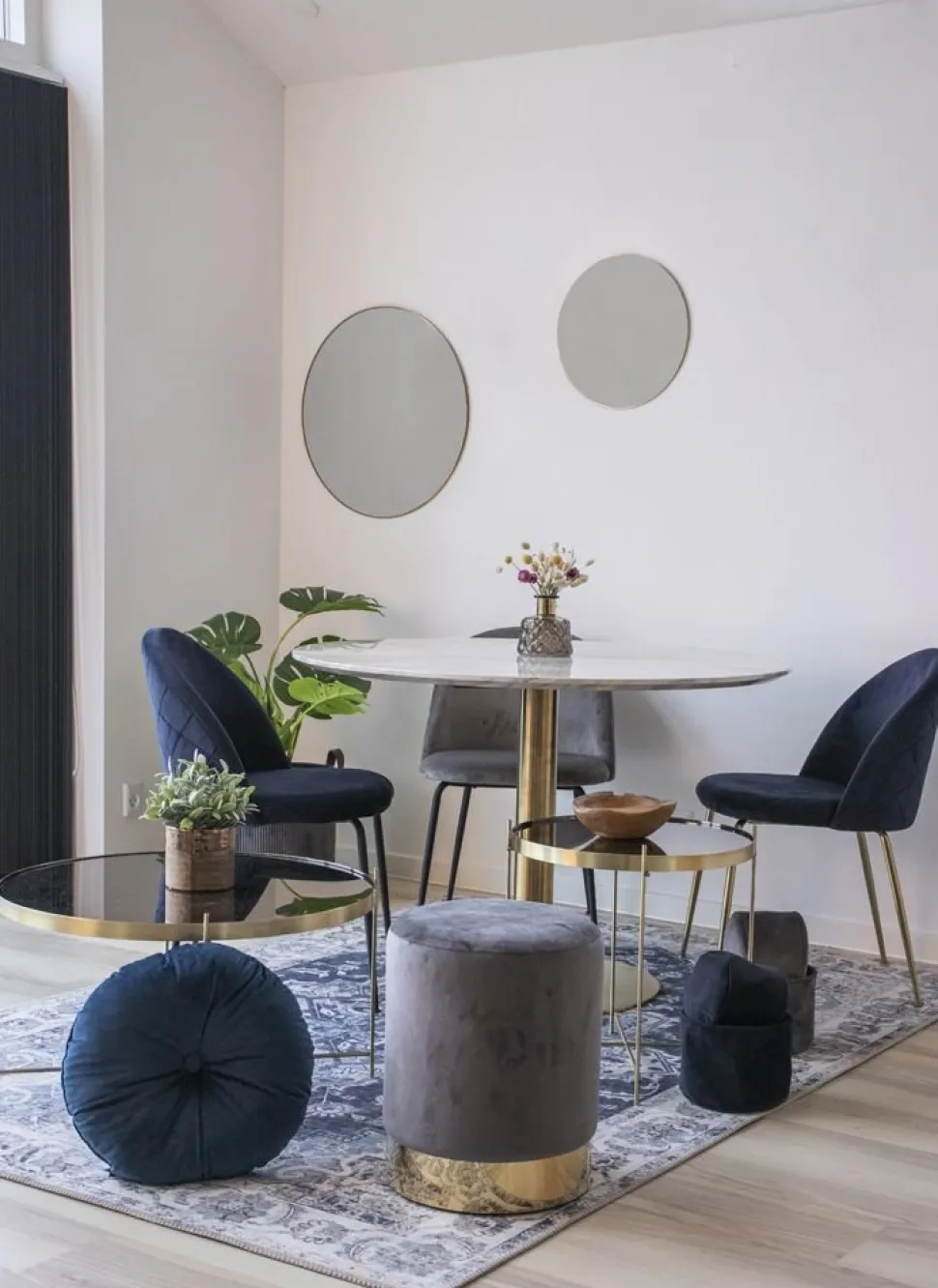 Matbord med bordsskiva i marmor imitation och ben i mässings utförande.