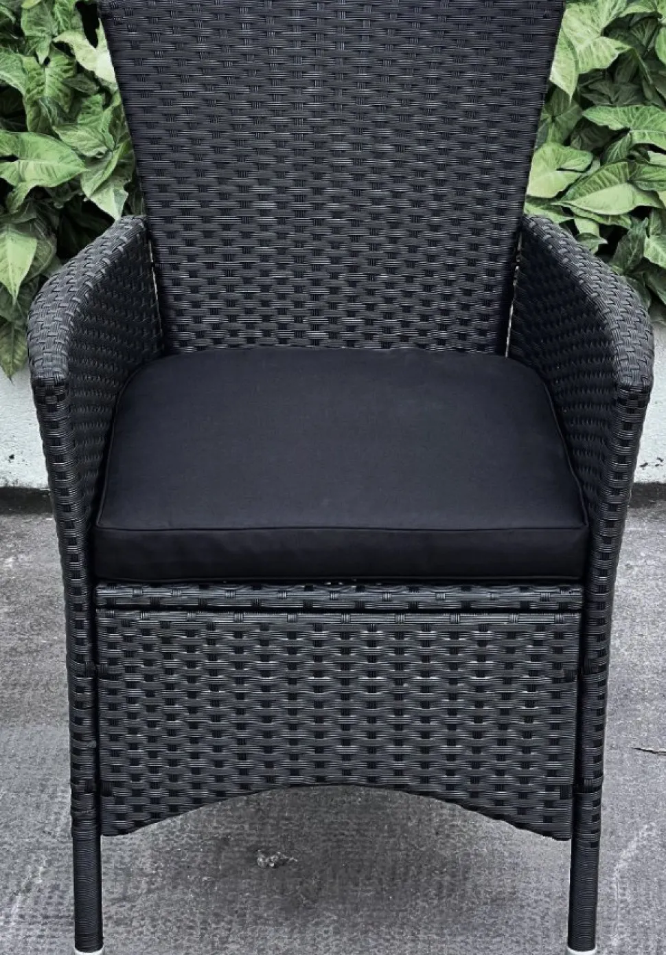 Brantevik utegrupp, stort runt matbord med 6 st karmstolar med dynor som ingår. Svart snygg konstrotting med svarta matchande sittdynor.