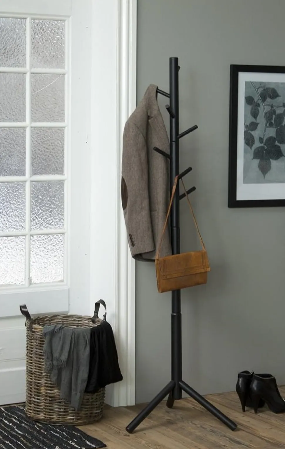 Klädhängare med snygg design och flera krokar. Svart trälack.