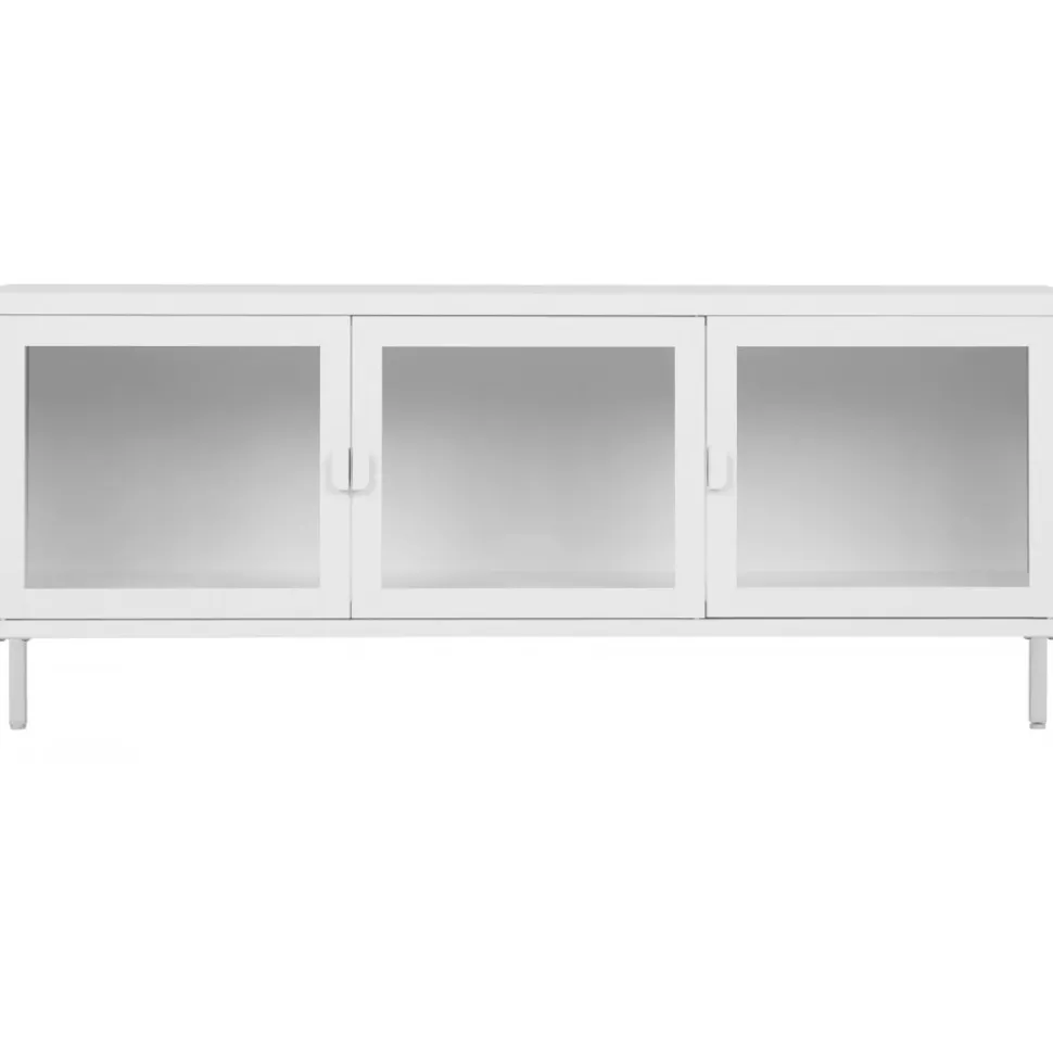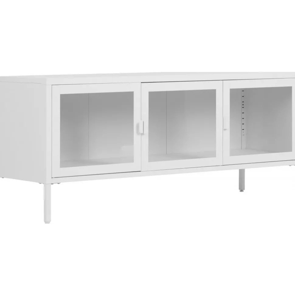 Mediabänk av stål med dörrar av glas.