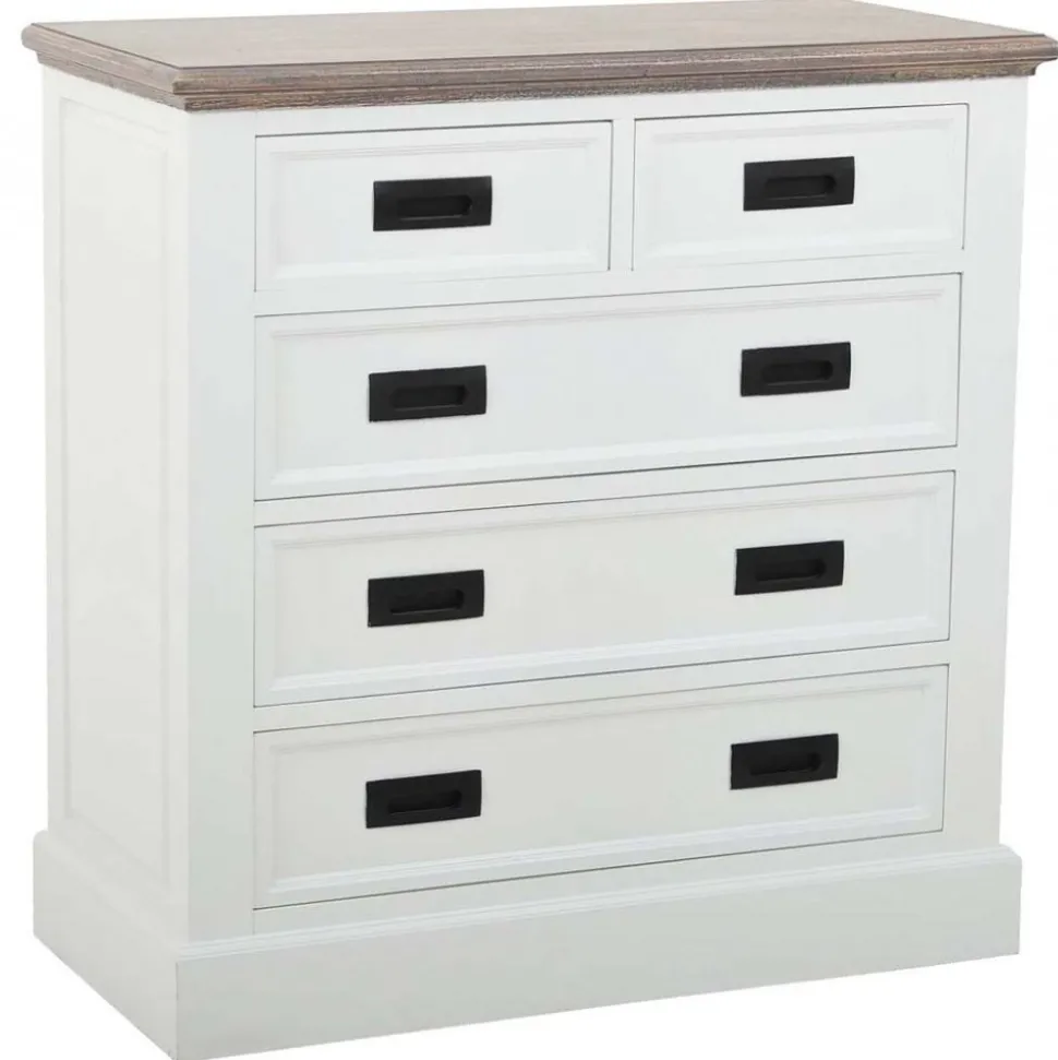 Modern i vitt/grått med goda förvaringsmöjligheter i de många lådorna. Svarta handtag som bryter av det vita på ett harmoniskt vis. En praktisk möbel som gör sig bra i de flesta hem. Ytskiktet på möbeln är behandlat för att ge ett vintage uttryck och har således lite märken och små skavanker. Färgskiftningar, märken, lagningar och småsprickor hör till dess unika utseende.