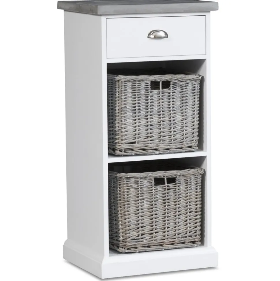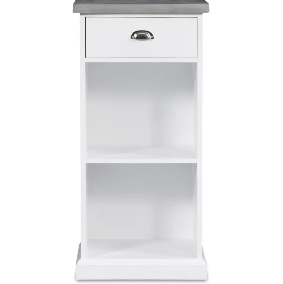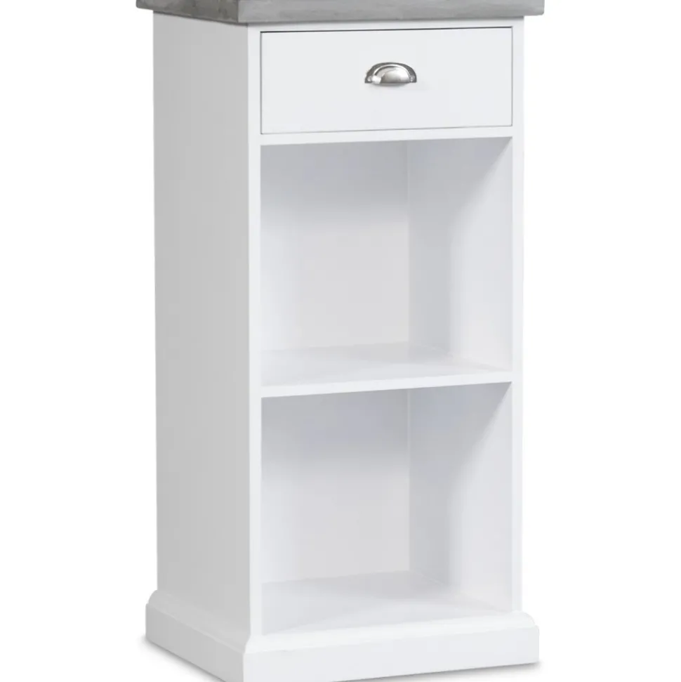 Stilfull i vit mdf med 1 st låda och 1 st hyllplan, toppskiva i cement. Toppskivan har ett ytskickt av microcement för att ge känslan av massiv cementskiva. Köp till hugokorgarna.