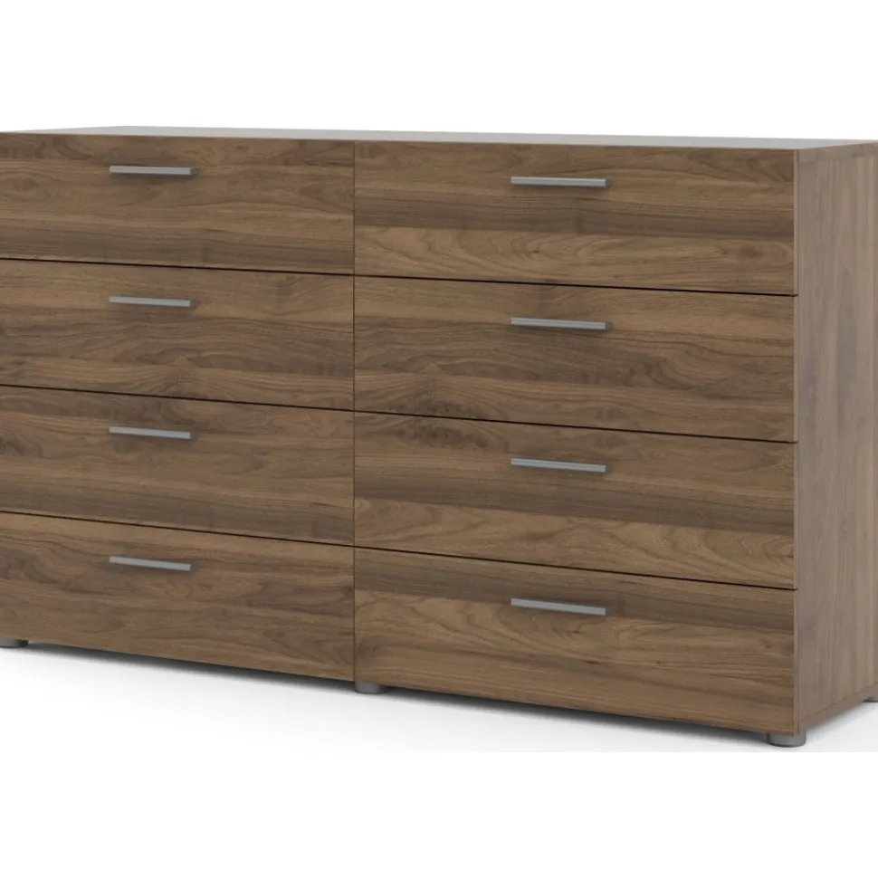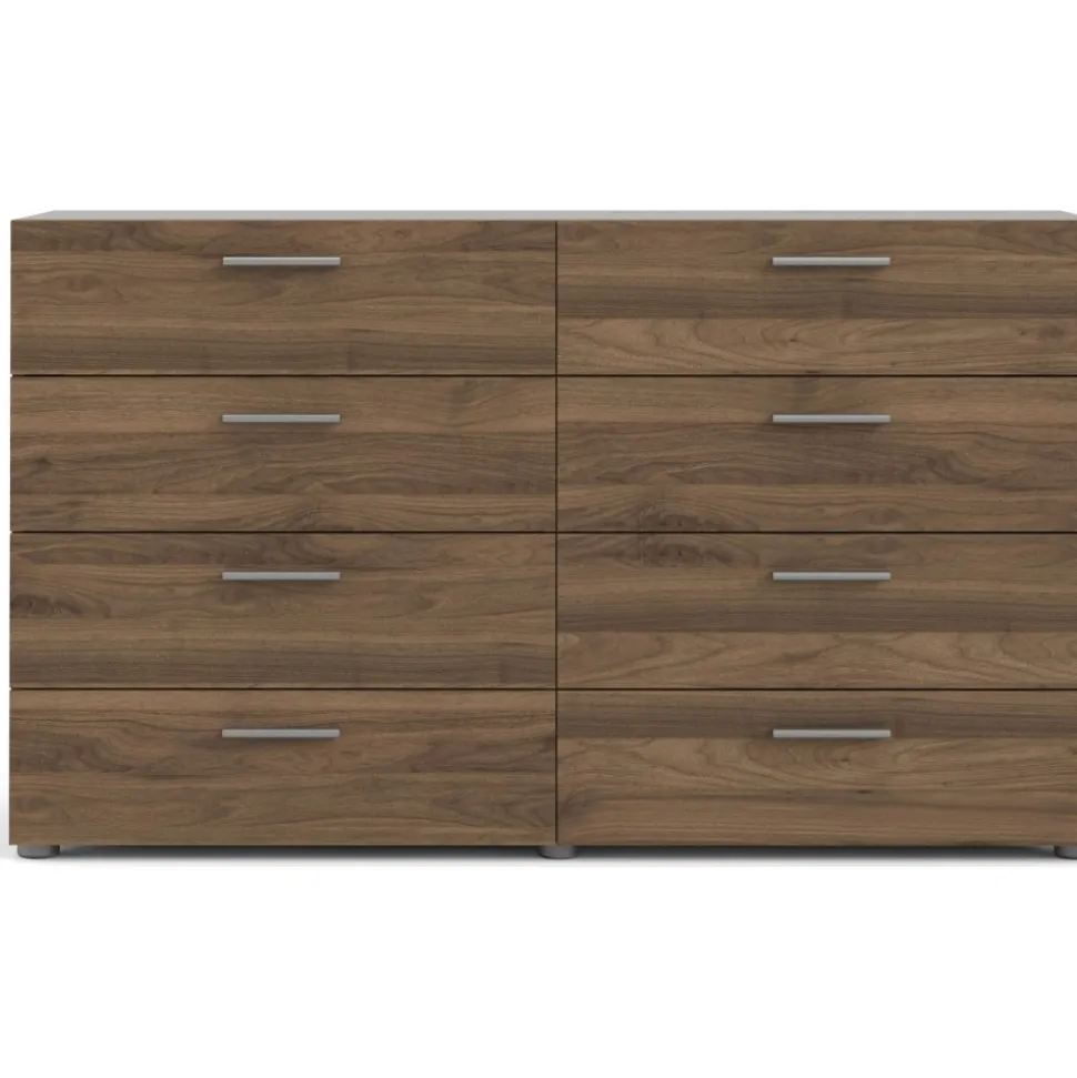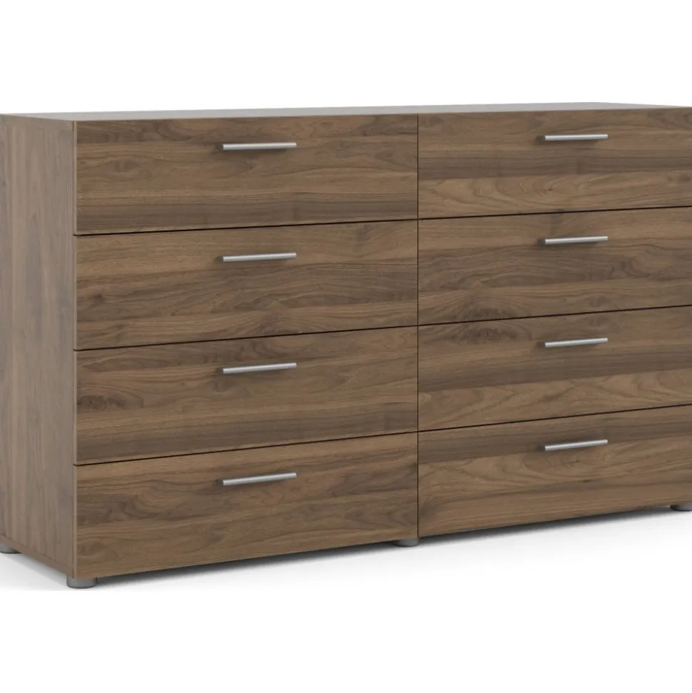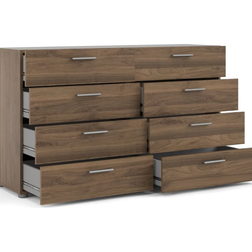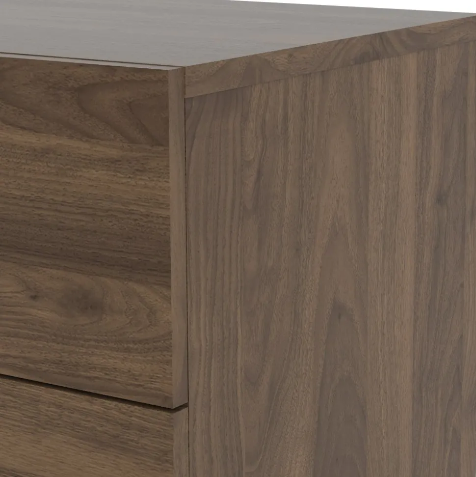 Byrå i laminerad valnöt. Lådskenor för enklare in och utdragning av lådorna.