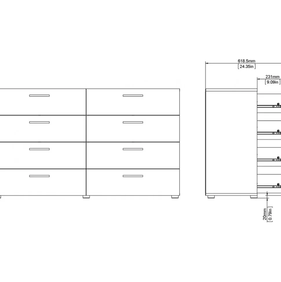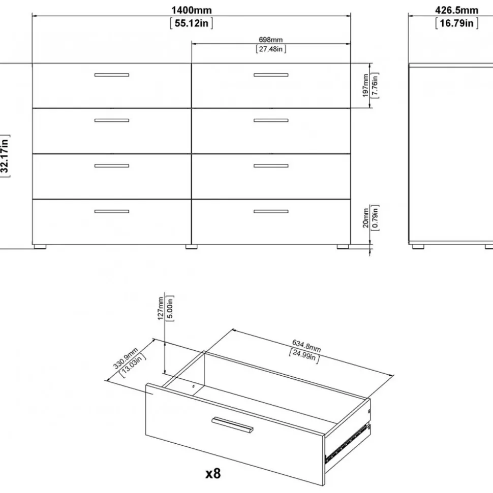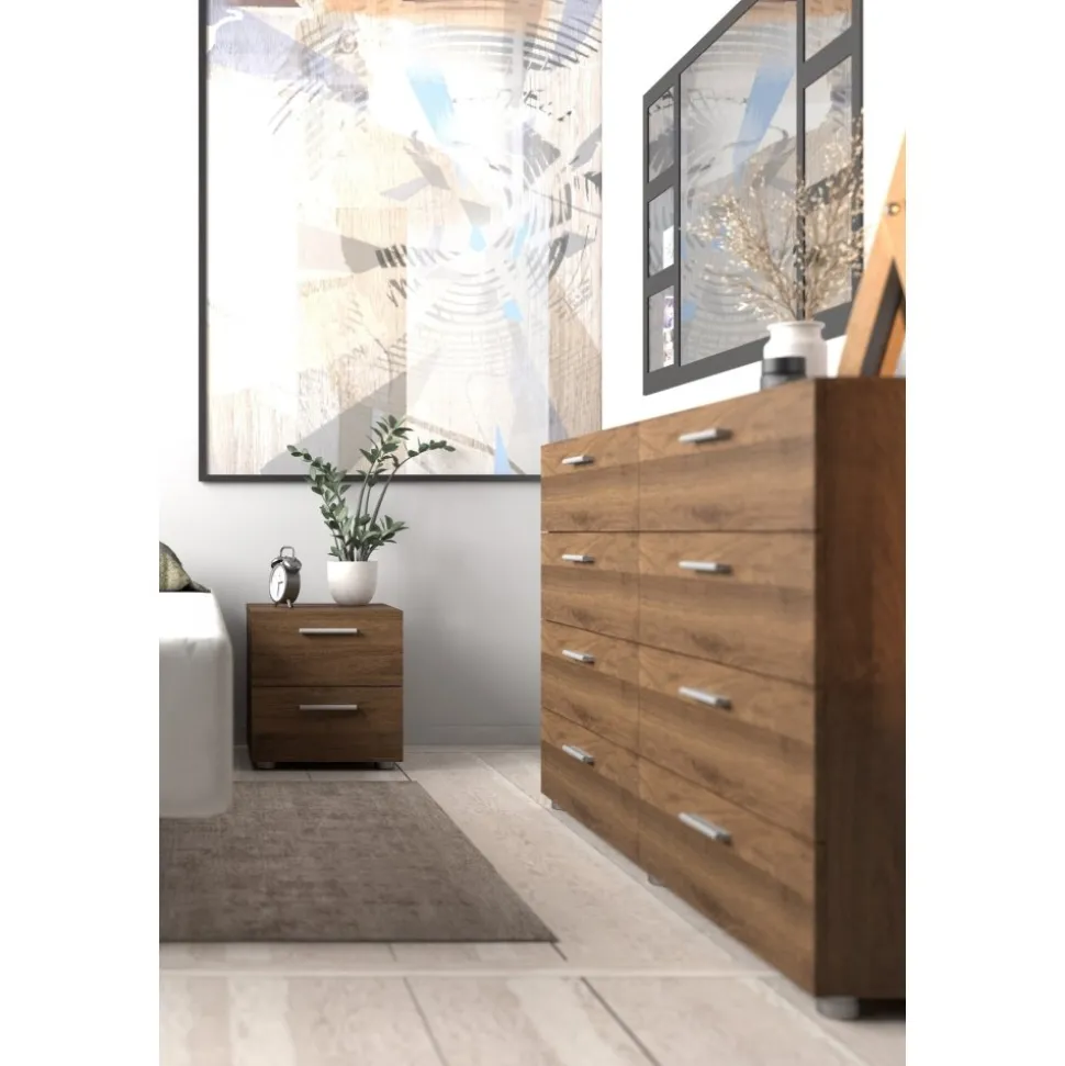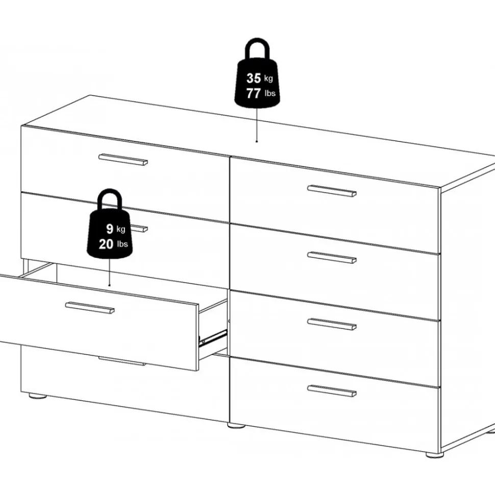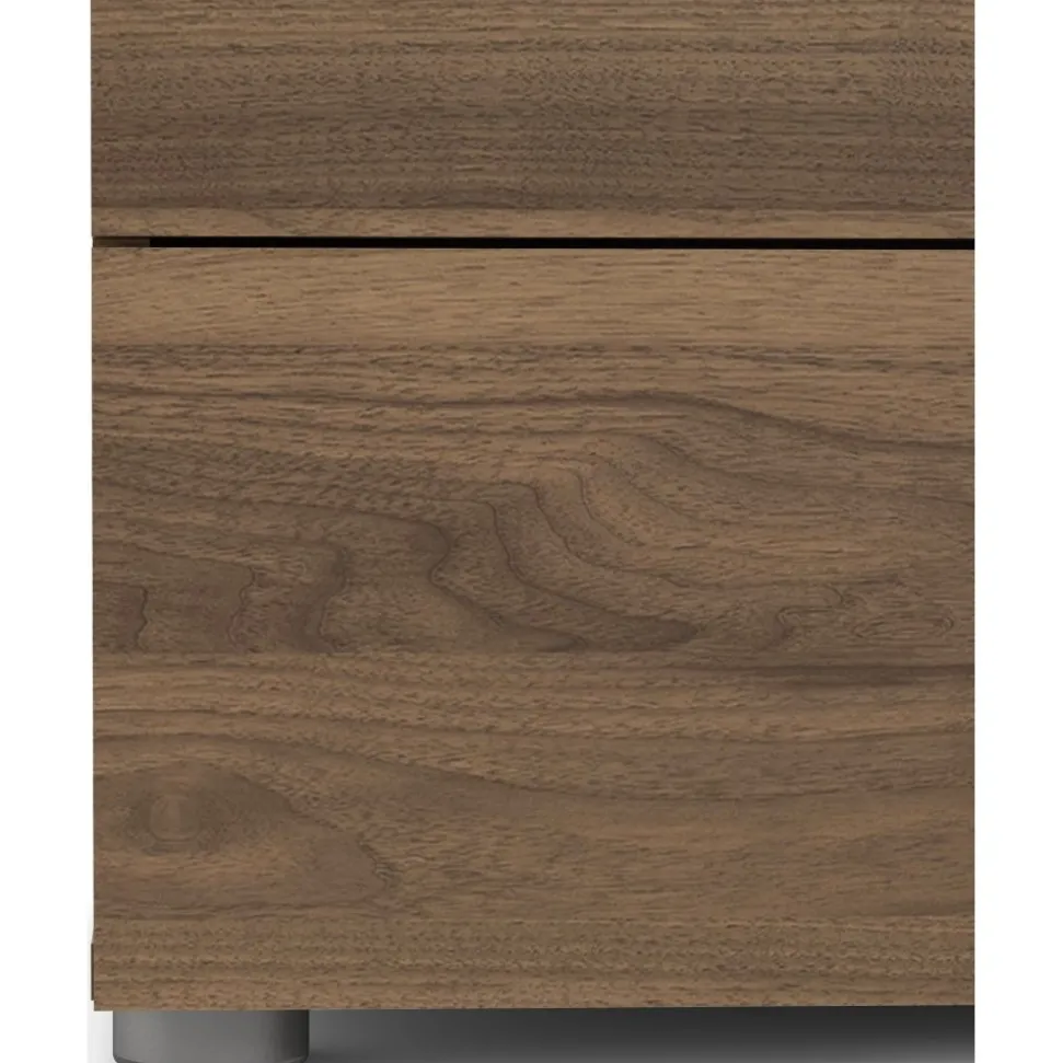 Byrå i laminerad valnöt. Lådskenor för enklare in och utdragning av lådorna.