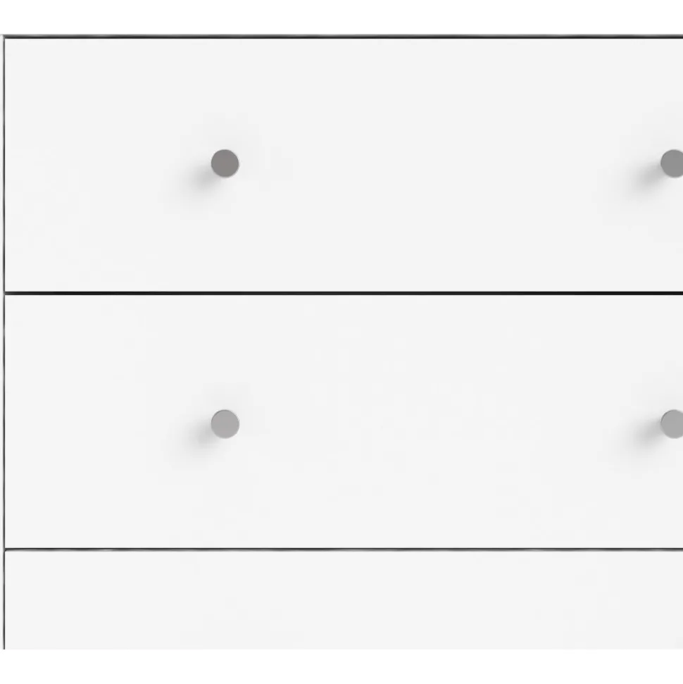 May vit är tillverkad av trä vilket ger en robust och hållbar struktur. För att öka hållbarheten och skydda ytan har byrån kantband av melamin, vilket bidrar till en slät och lättskött finish. Byrån är utrustad med praktiska handtag och ben i plast, vilket inte bara ger en modern touch, utan även gör den lätt att flytta och positionera. Den minimalistiska designen passar in i olika inredningsstilar och adderar en stilren känsla i rummet.