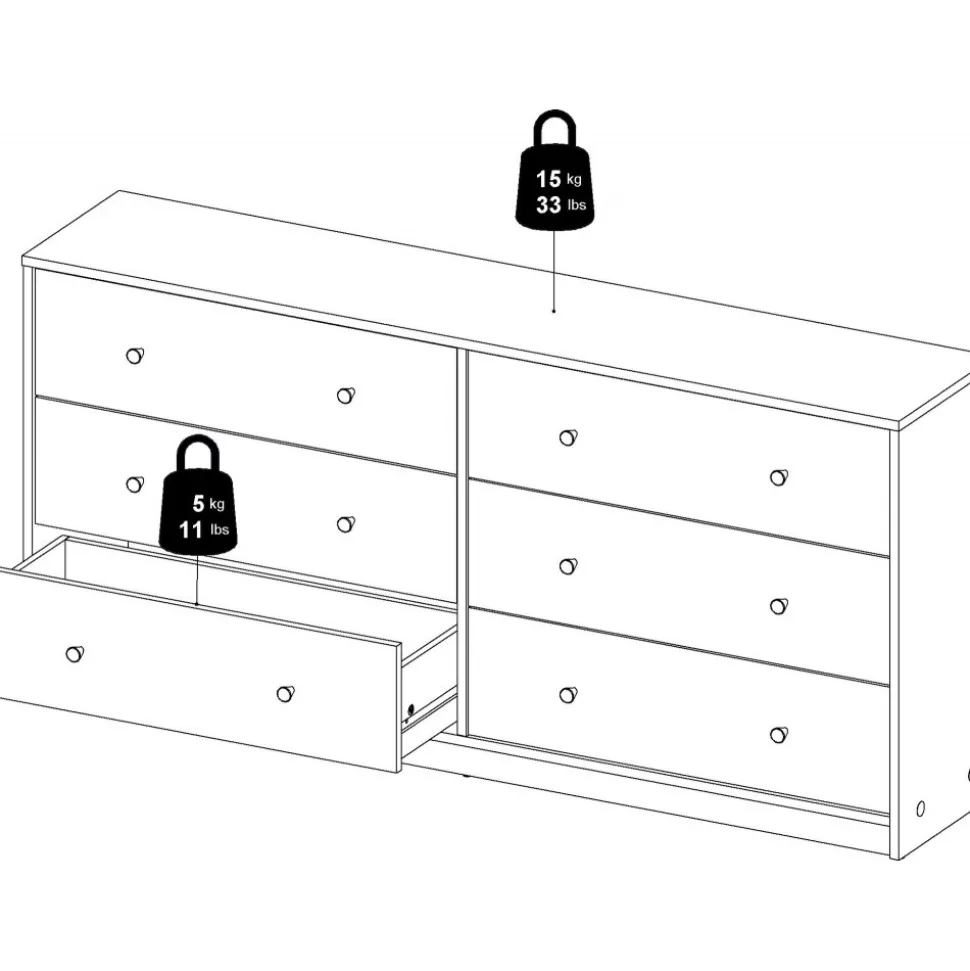 May vit är tillverkad av trä vilket ger en robust och hållbar struktur. För att öka hållbarheten och skydda ytan har byrån kantband av melamin, vilket bidrar till en slät och lättskött finish. Byrån är utrustad med praktiska handtag och ben i plast, vilket inte bara ger en modern touch, utan även gör den lätt att flytta och positionera. Den minimalistiska designen passar in i olika inredningsstilar och adderar en stilren känsla i rummet.