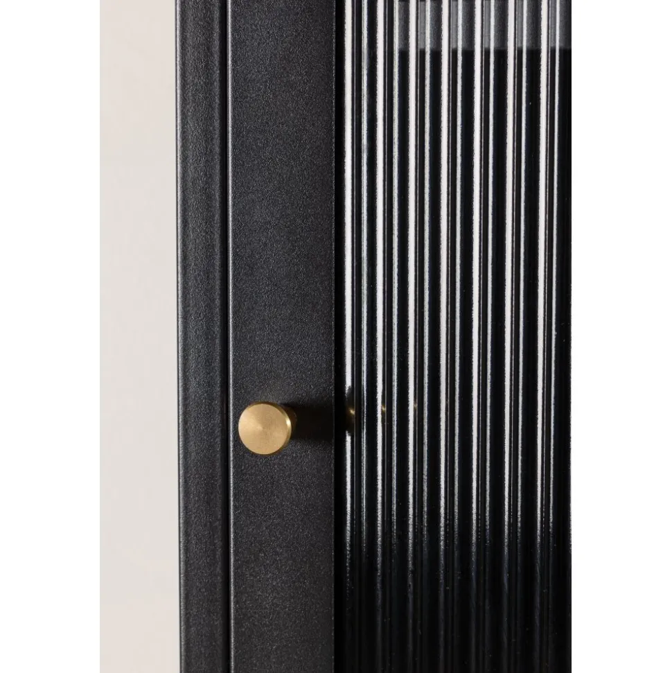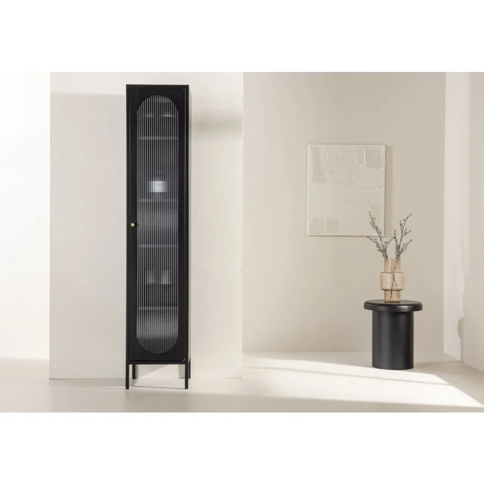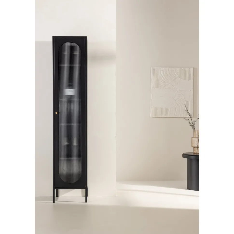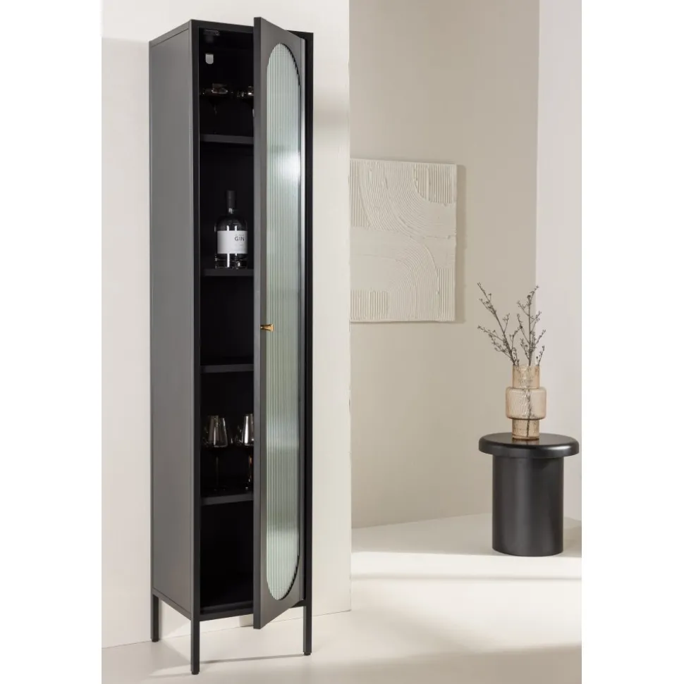 Med Cali stålskåp får du en smakfull och praktisk förvaringslösning som förenar stil och funktionalitet. Skåpet är en uttrycksfull och pålitlig möbel som passar perfekt i både moderna och traditionella inredningar. Den eleganta svarta färgen ger skåpet en tidlös karaktär som kommer att komplettera din heminredning med elegans. Skåpet är utrustat med fyra rymliga hyllplan, vilket ger dig gott om utrymme för att organisera. Dörren till skåpet är tillverkad av vågigt glas, vilket ger en subtil touch av textur och en unik visuell dimension till möbeln. Ge din inredning en uppgradering med Cali stålskåp och skapa en stilfull och organiserad atmosfär i ditt hem. Oavsett om du placerar den i vardagsrummet, sovrummet eller kontoret kommer Cali att vara ett praktiskt och elegant tillskott till din inredning. Levereras omonterad.