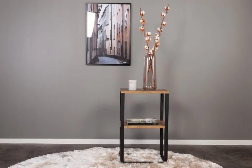 Nätt med två st hyllplan i MDF med imitation av teak. Stomme av svart metall.