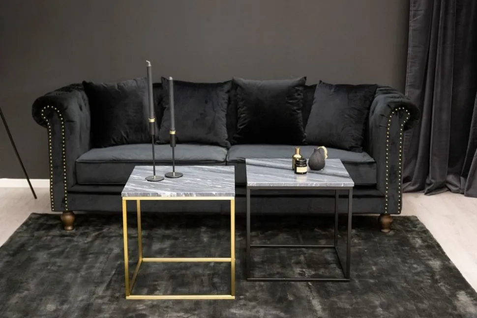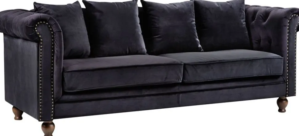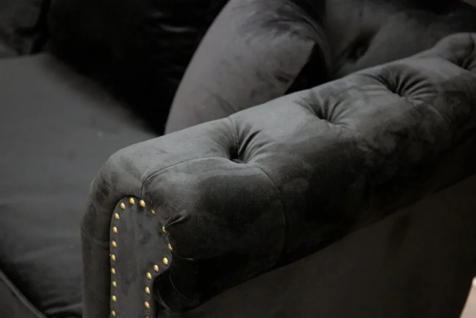 Stilig klädd med ett svart sammetstyg. Dekorativa nitar framtill. Stommen är av massivt trä.