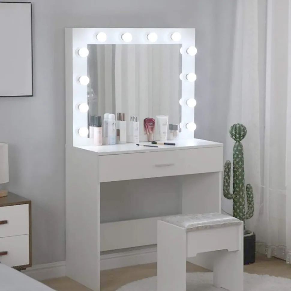 Sminkbord av trä med 12 st LED-lampor. Bordet har en stor låda med 2 st förvaringsutrymmen. Pall med vackert mönstrat tyg ingår.
