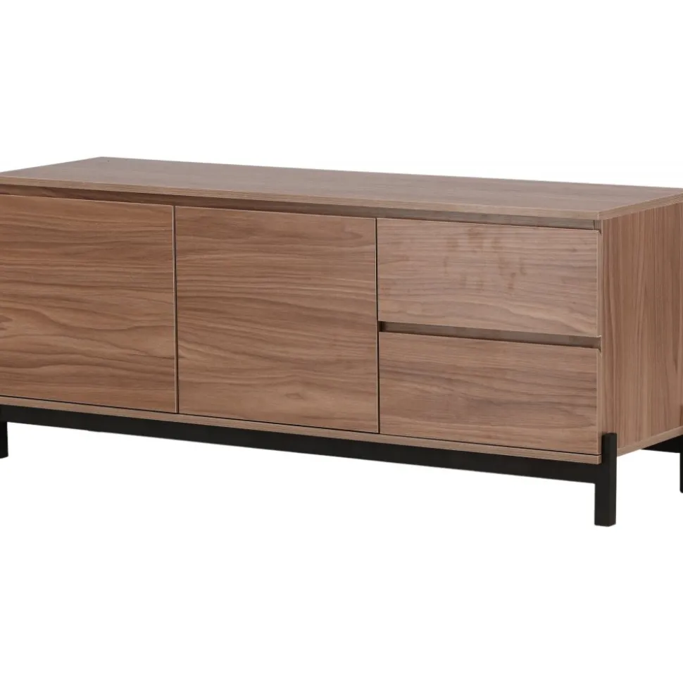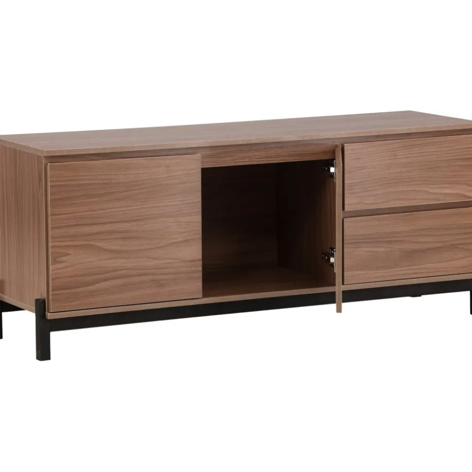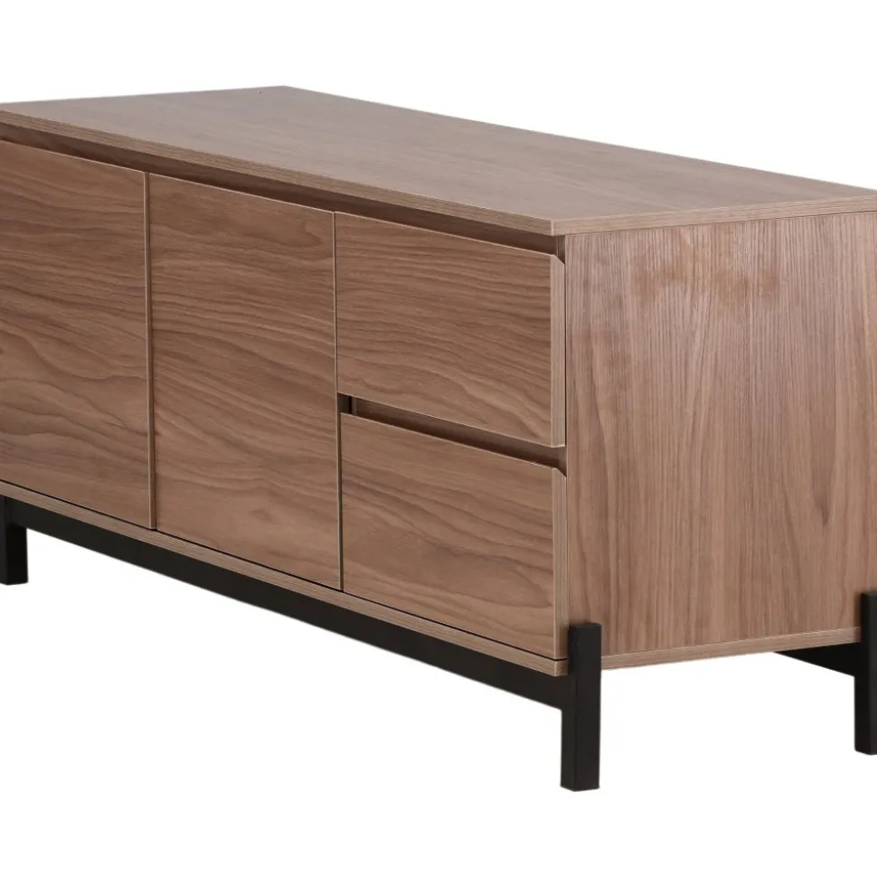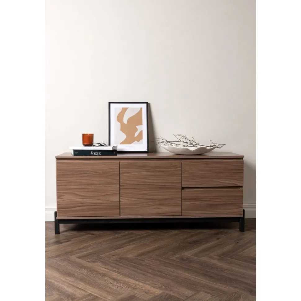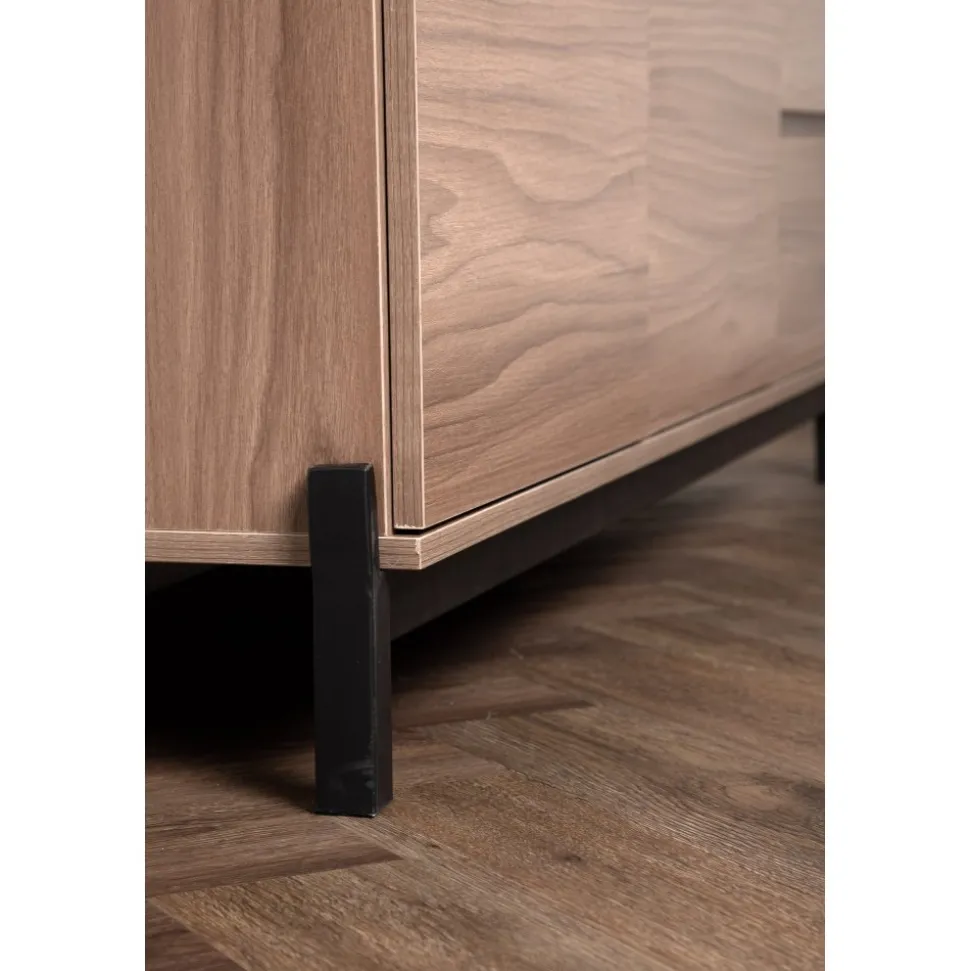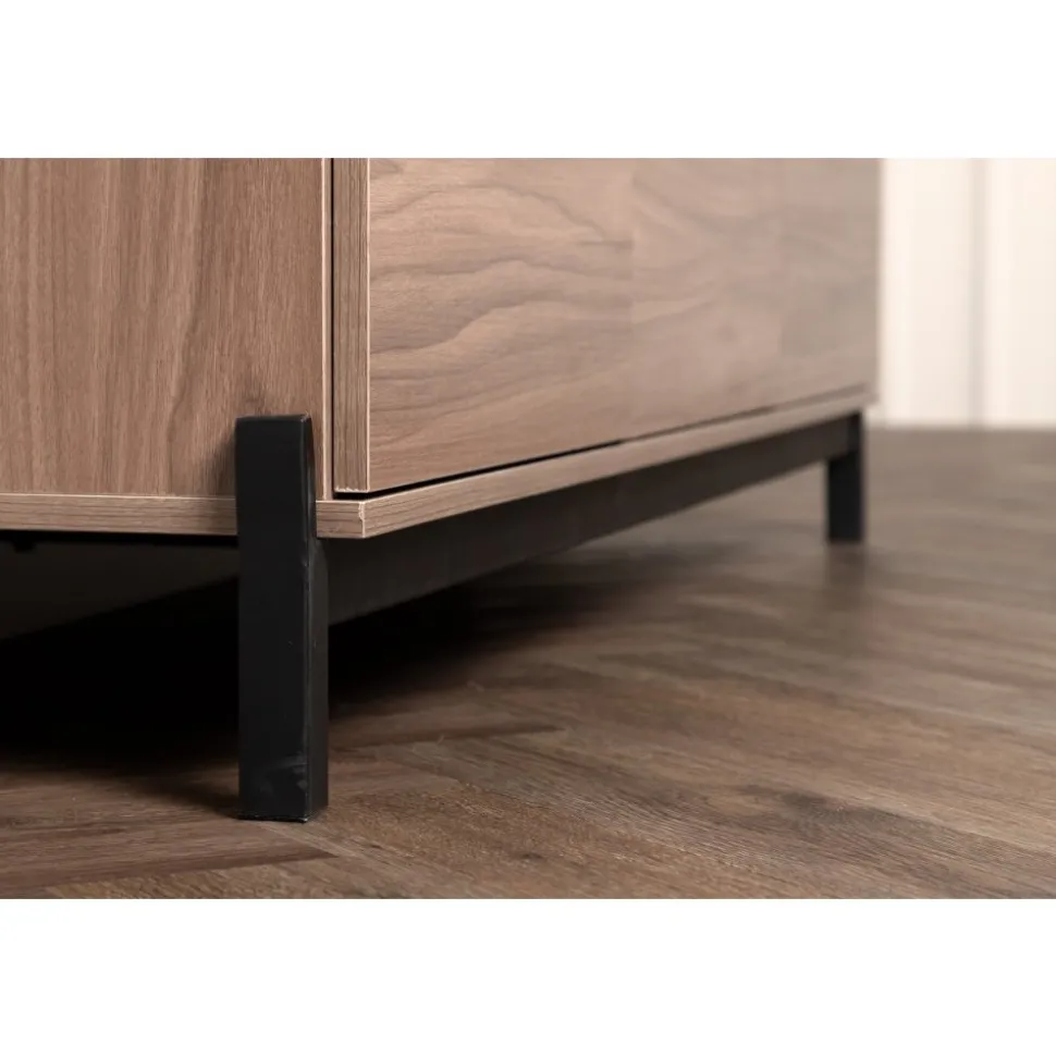 Lika praktisk som stilren! Den robusta designen ger ett stadigt intryck och den valnötsfärgade kulören skapar en trivsam värme i hemmet. Tillverkad i valnötsfärgad MDF och upplyft av fyra svarta ben i dekorativ design. Den här möblen har två vänsterjusterade skåp och två högerjusterade lådor som möjliggör generöst med plats för dold förvaring.