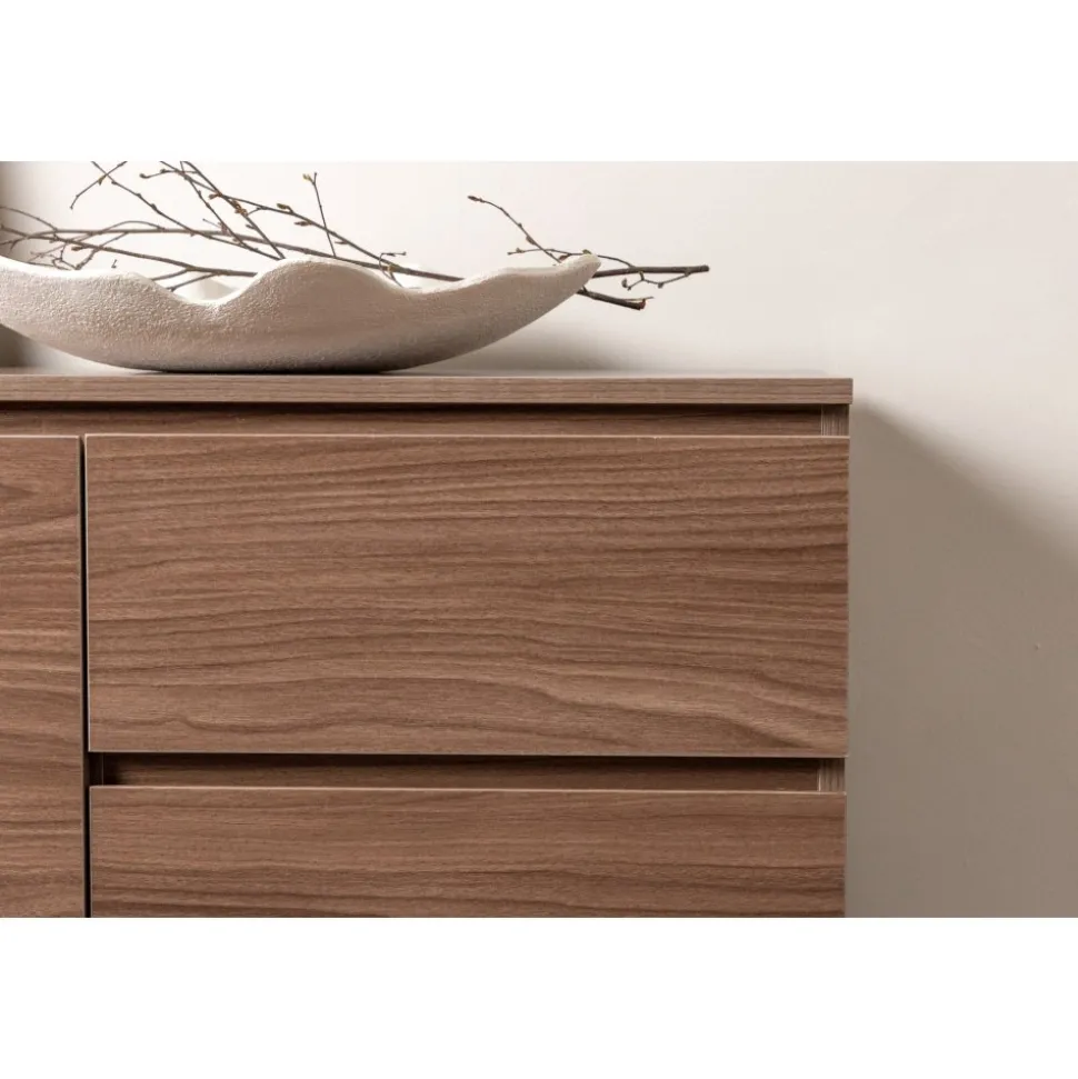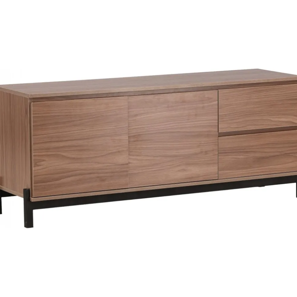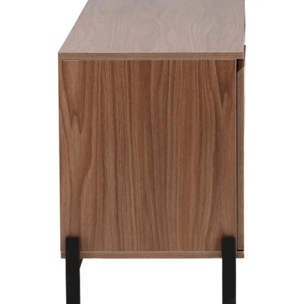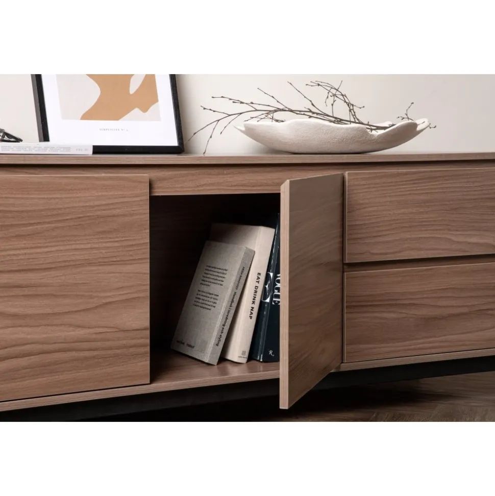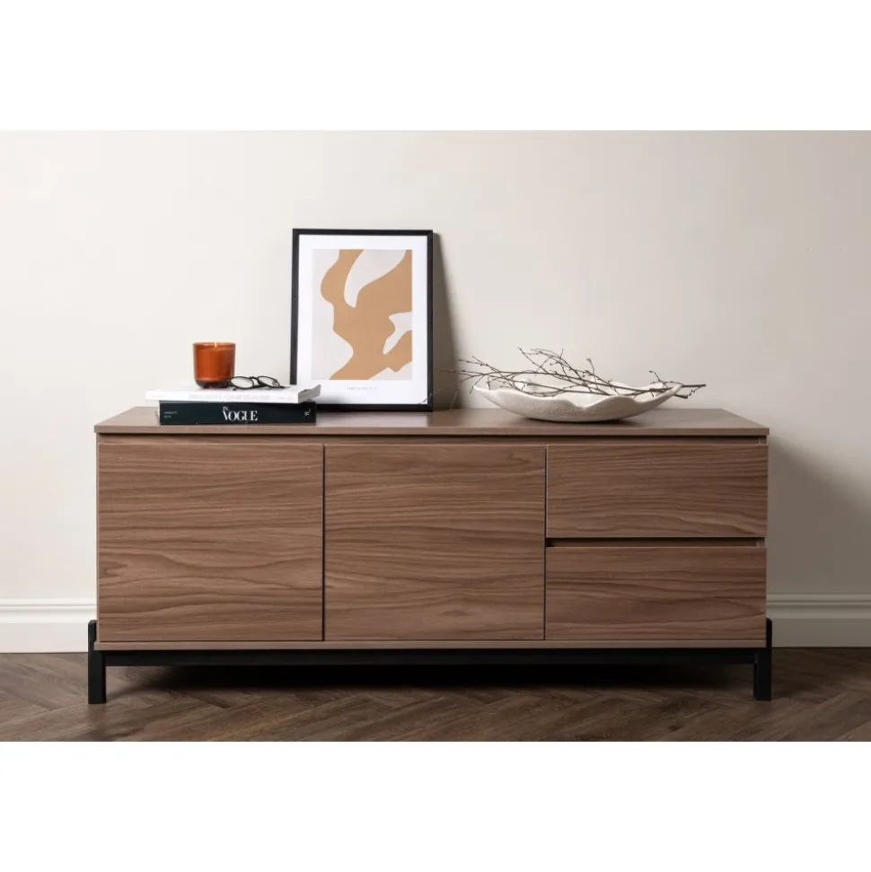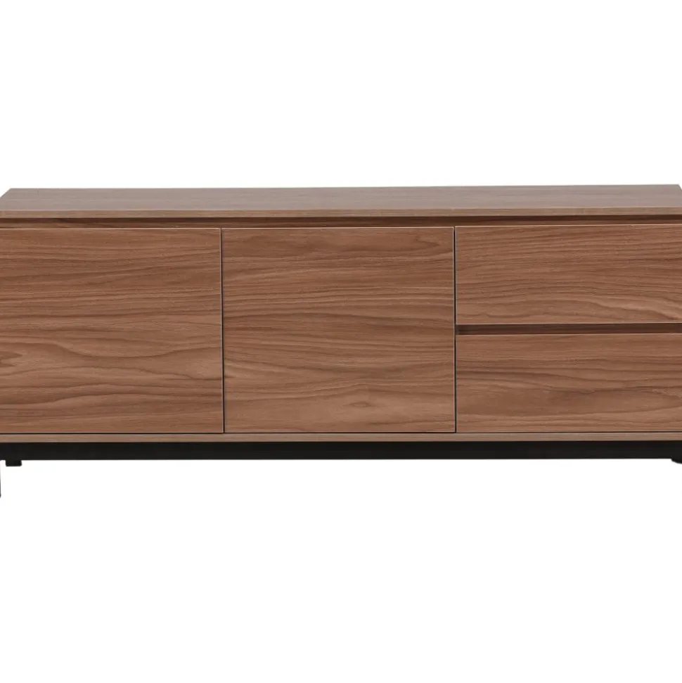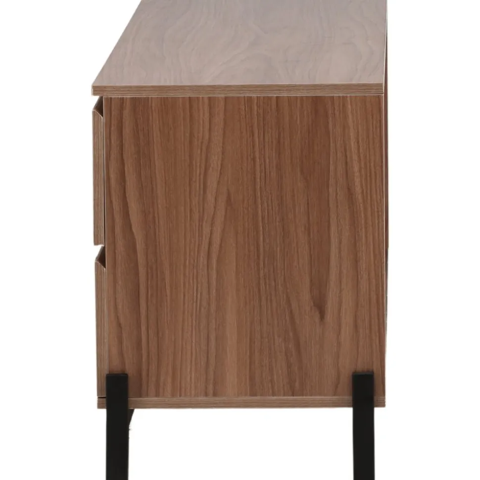 Lika praktisk som stilren! Den robusta designen ger ett stadigt intryck och den valnötsfärgade kulören skapar en trivsam värme i hemmet. Tillverkad i valnötsfärgad MDF och upplyft av fyra svarta ben i dekorativ design. Den här möblen har två vänsterjusterade skåp och två högerjusterade lådor som möjliggör generöst med plats för dold förvaring.