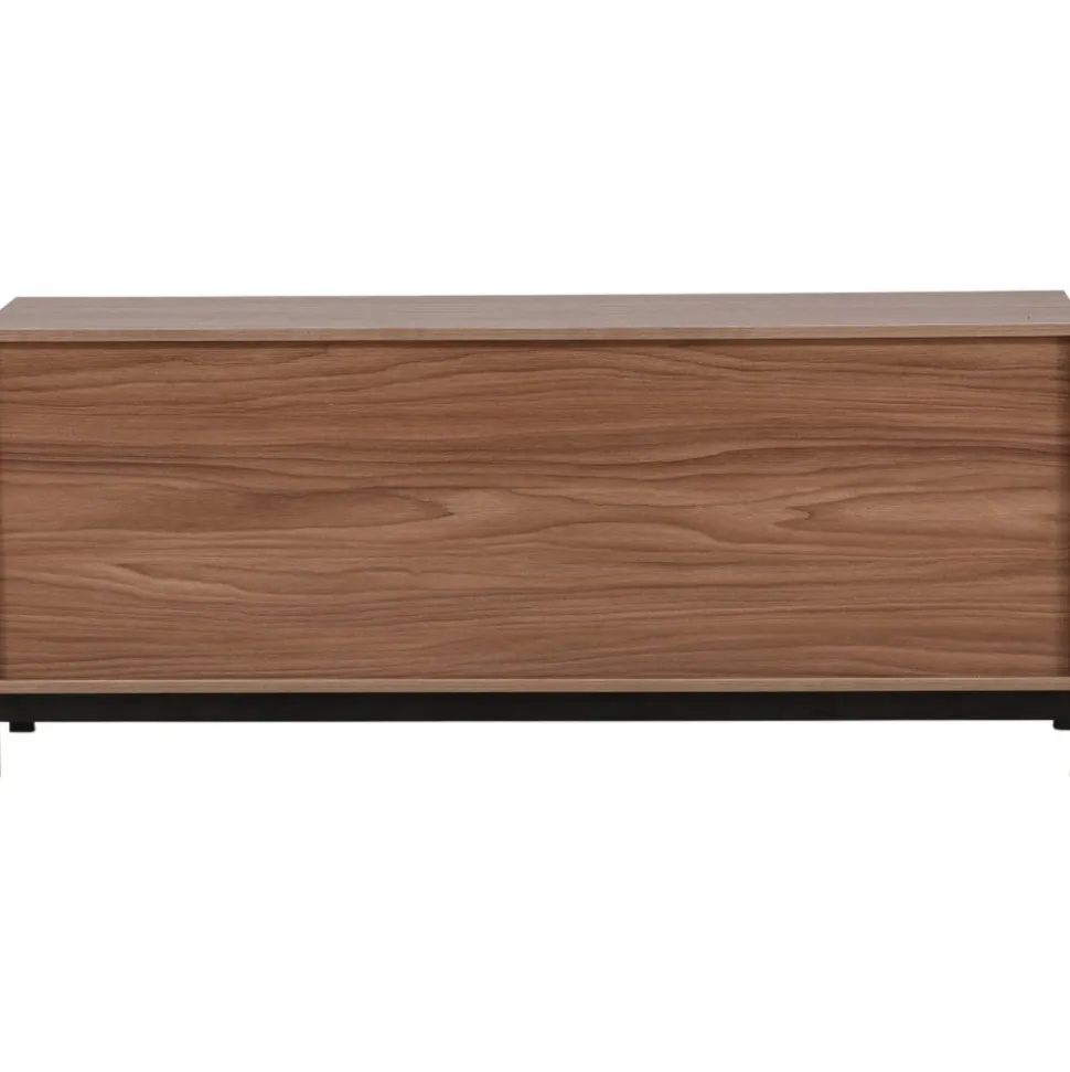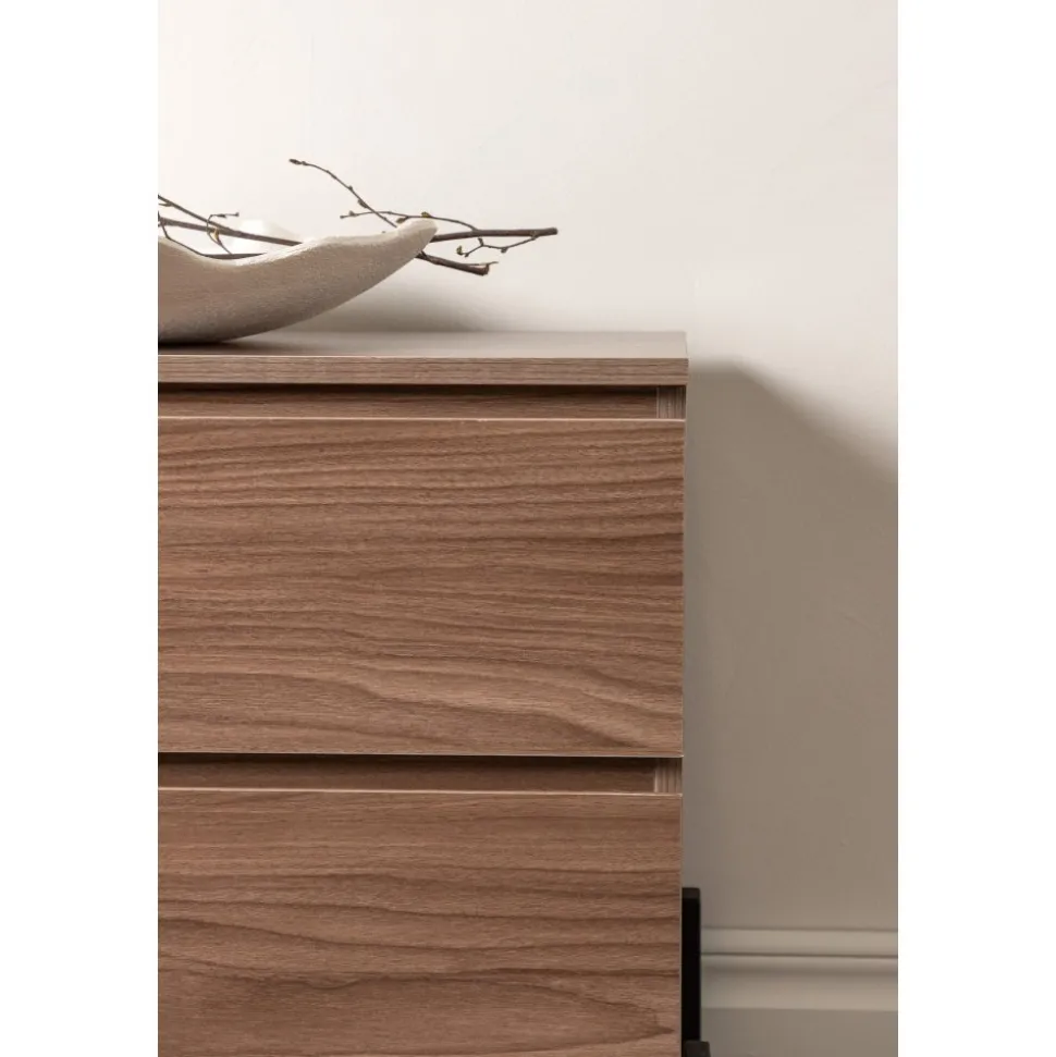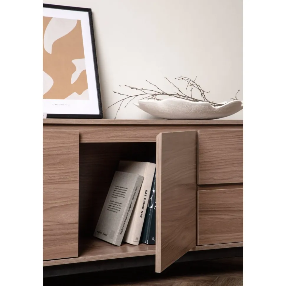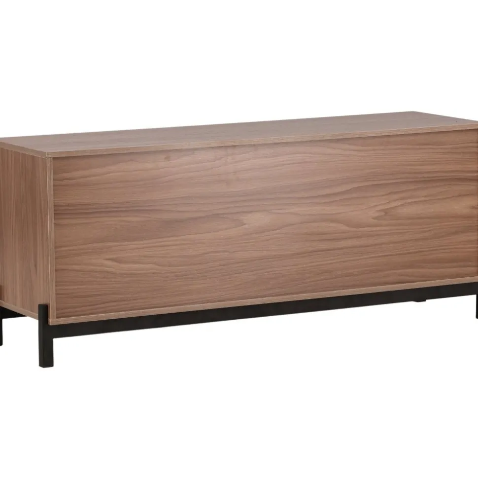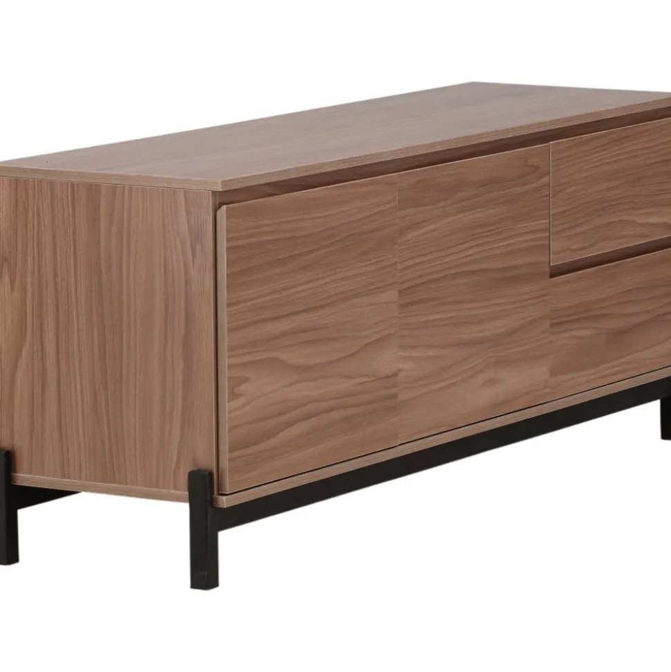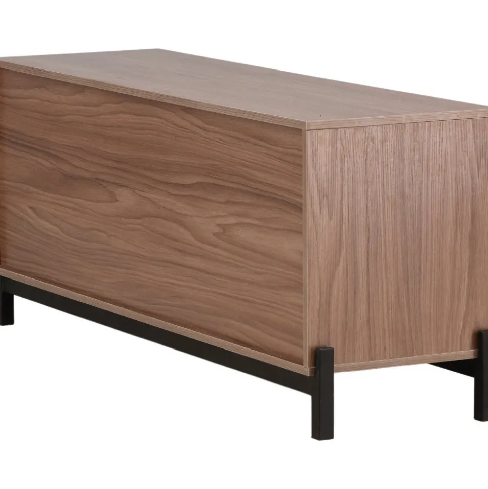 Lika praktisk som stilren! Den robusta designen ger ett stadigt intryck och den valnötsfärgade kulören skapar en trivsam värme i hemmet. Tillverkad i valnötsfärgad MDF och upplyft av fyra svarta ben i dekorativ design. Den här möblen har två vänsterjusterade skåp och två högerjusterade lådor som möjliggör generöst med plats för dold förvaring.