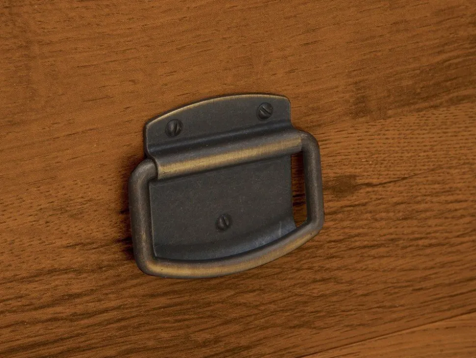 En mediabänk i kolonialstil med metallhandtag och metallbeslag. Mediabänken har en låda med ett öppet fack ovanför. Det förborrade hålet hjälper till att få ordning på kablarna men fungerar också som ventilation till den elektroniska utrusningen