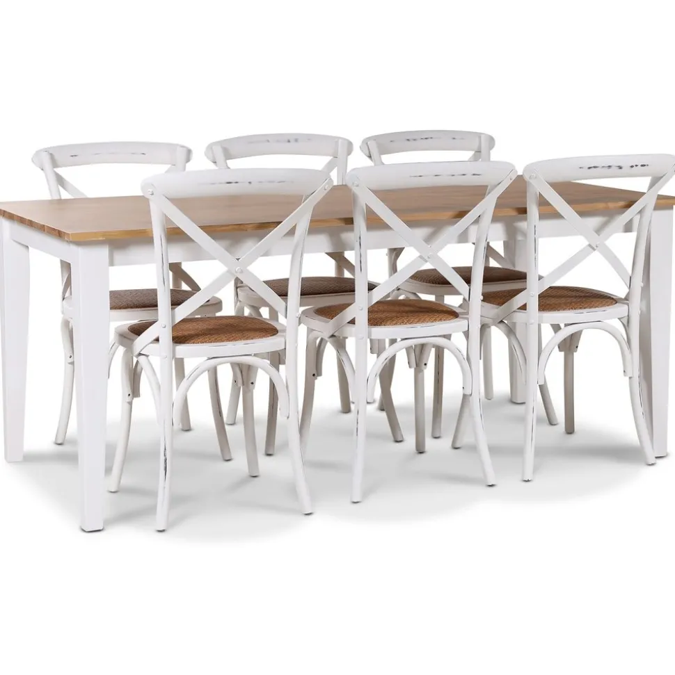 Matgrupp från Skånska Möbelhuset, Klassiskt 180 cm matbord med vitlackat underrede och bordsskiva i oljad ek. Sex stycken klassiska Gaston matstolar matchar denna matgruppen perfekt.