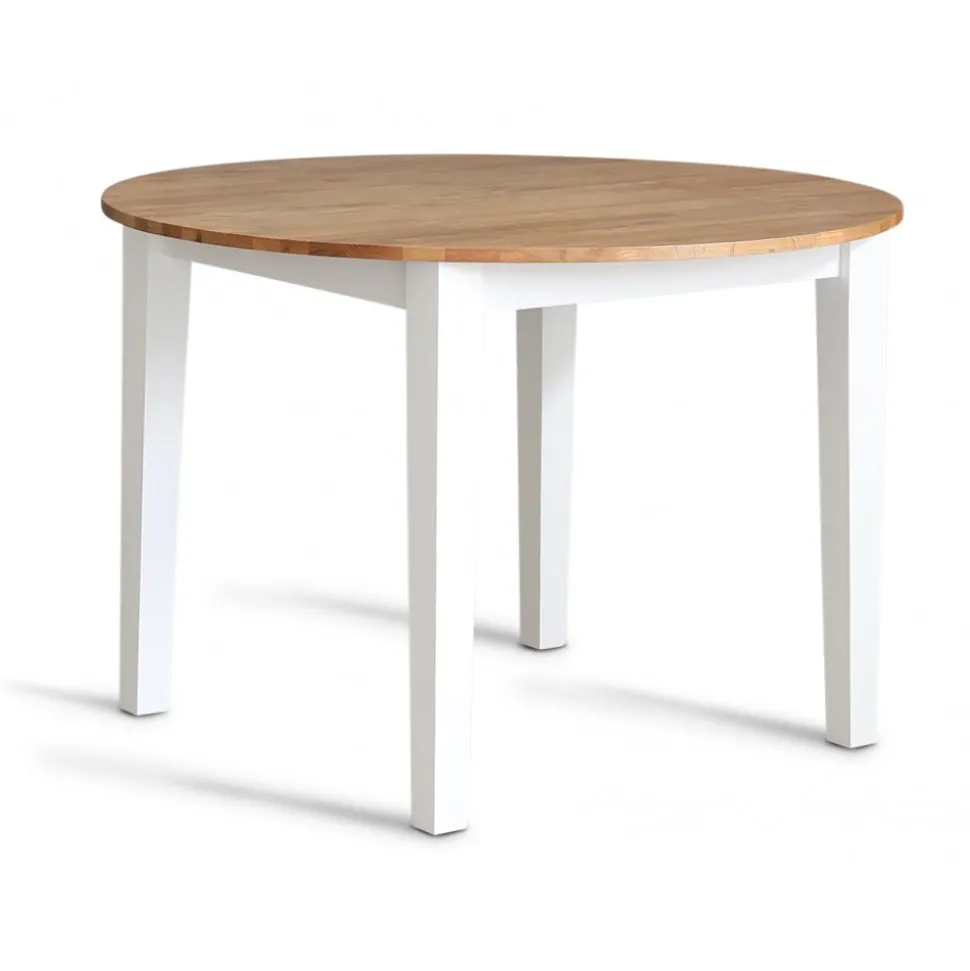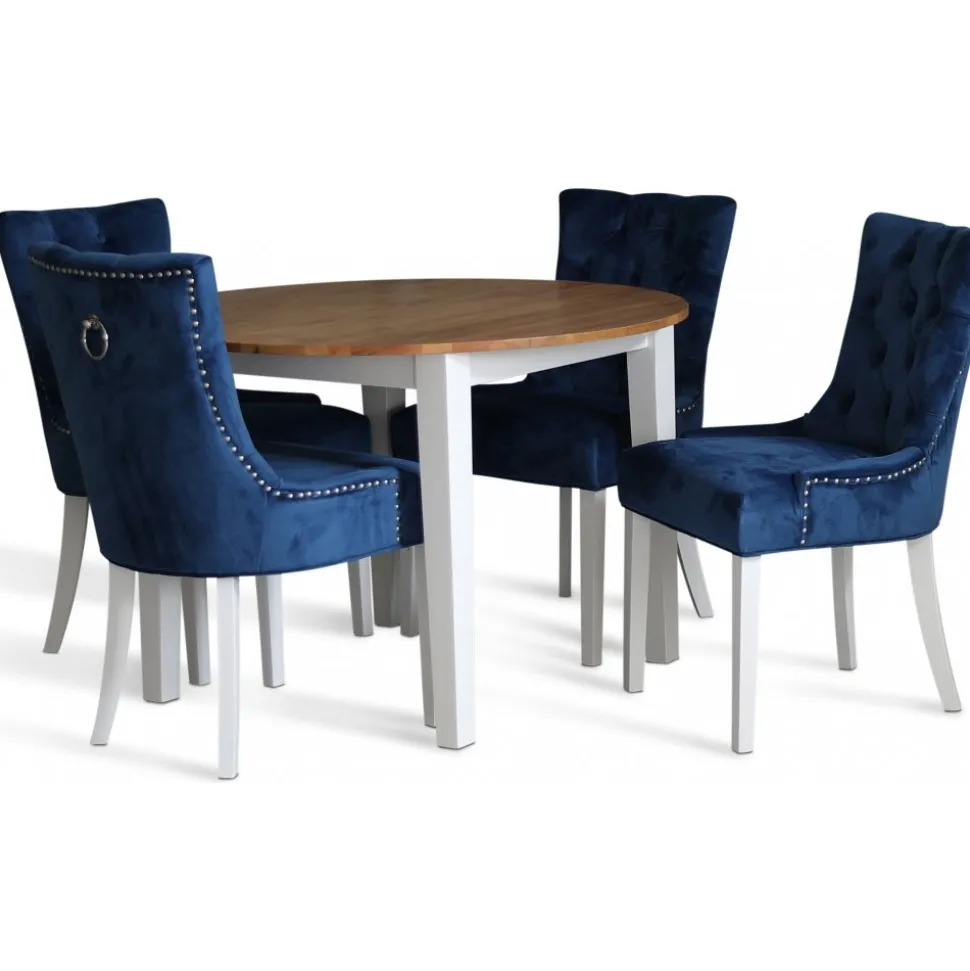 Dalsland med runt matbord med toppskiva i oljad ek och vitlackat underrede. 4 st Tuva stolar i blå sammet.