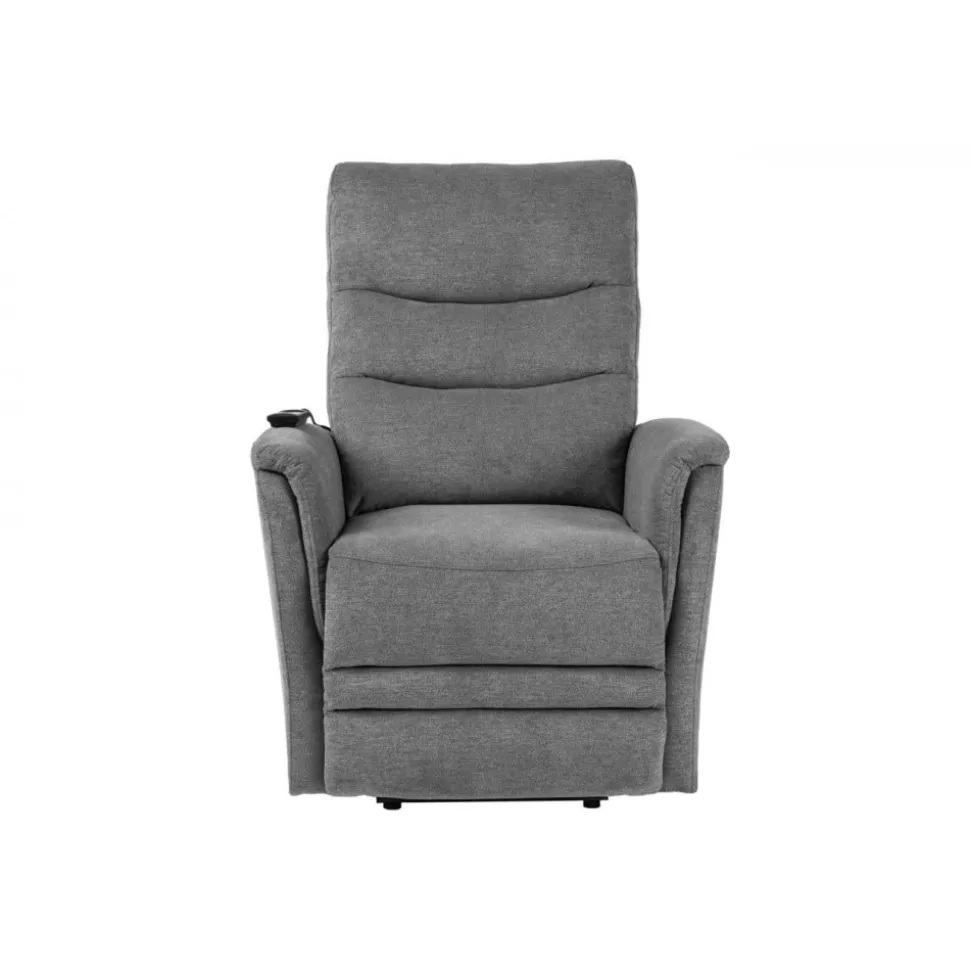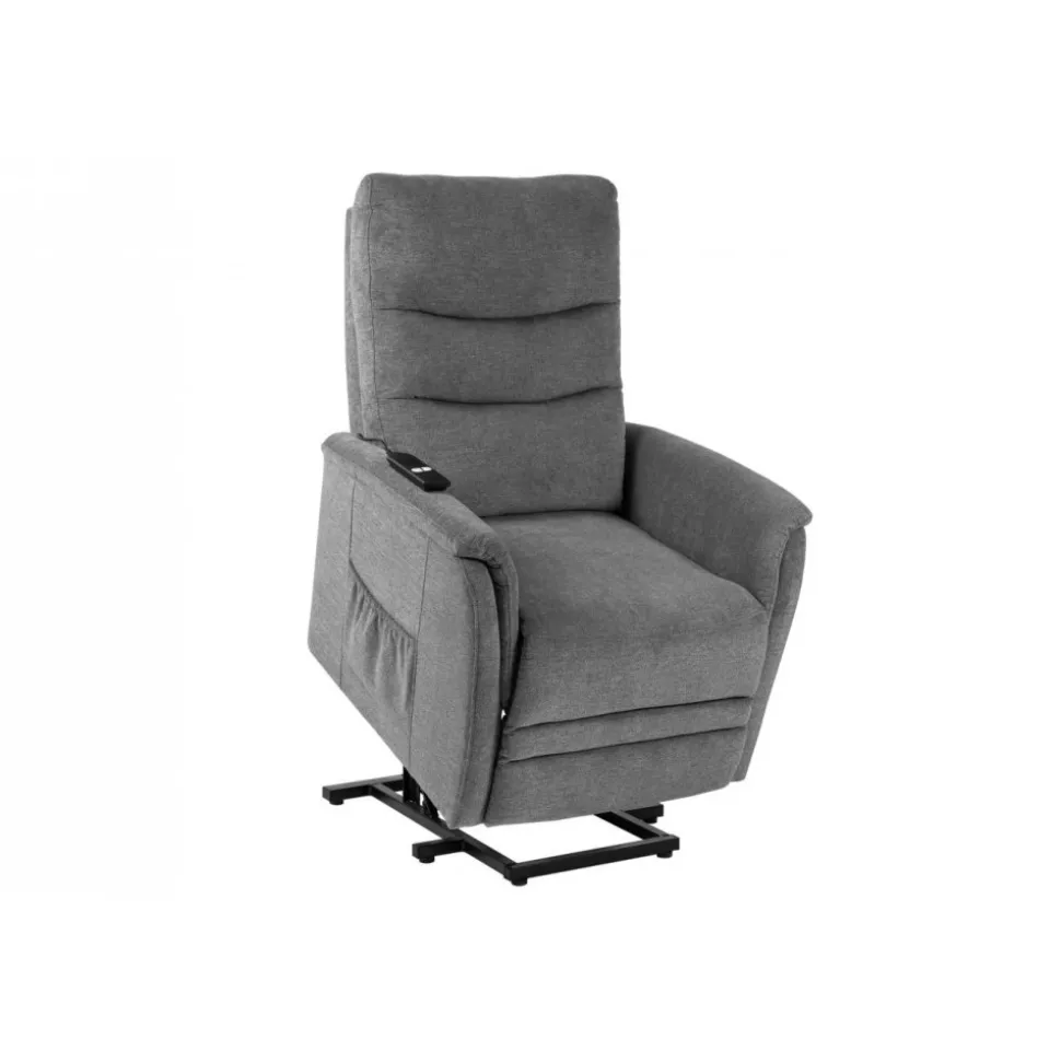 Eldriven i grått tyg. Fjärrkontrollstyrning med ficka för fjärr på sidan. Rustad med lyft funktion som hjälper till att resa sig från fåtöljen. Maxvikt 120kg.