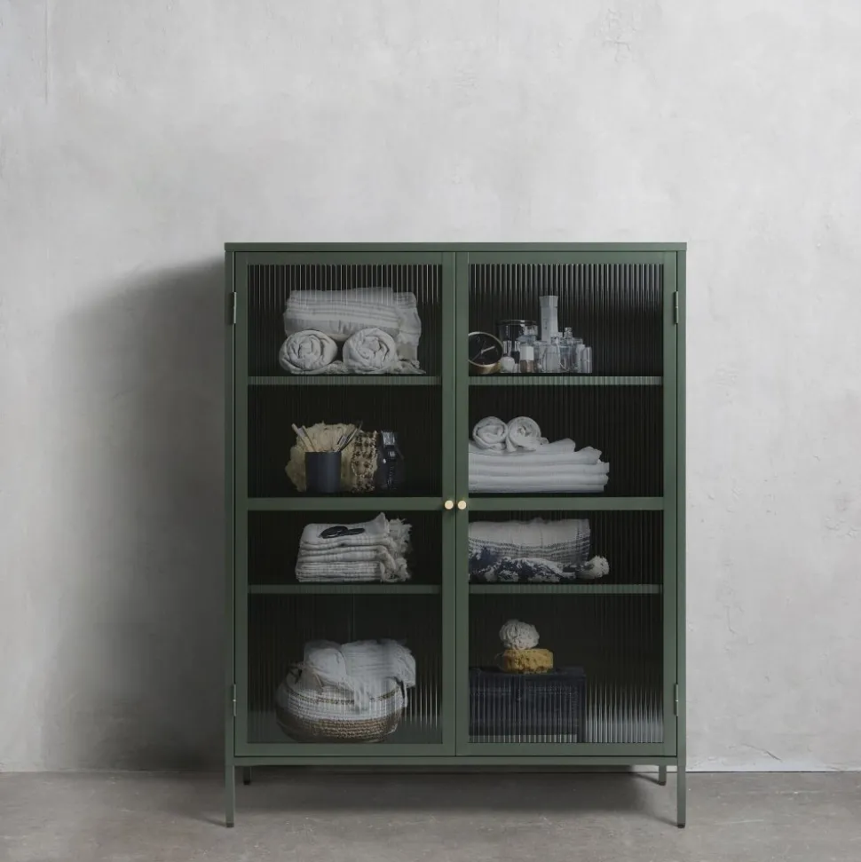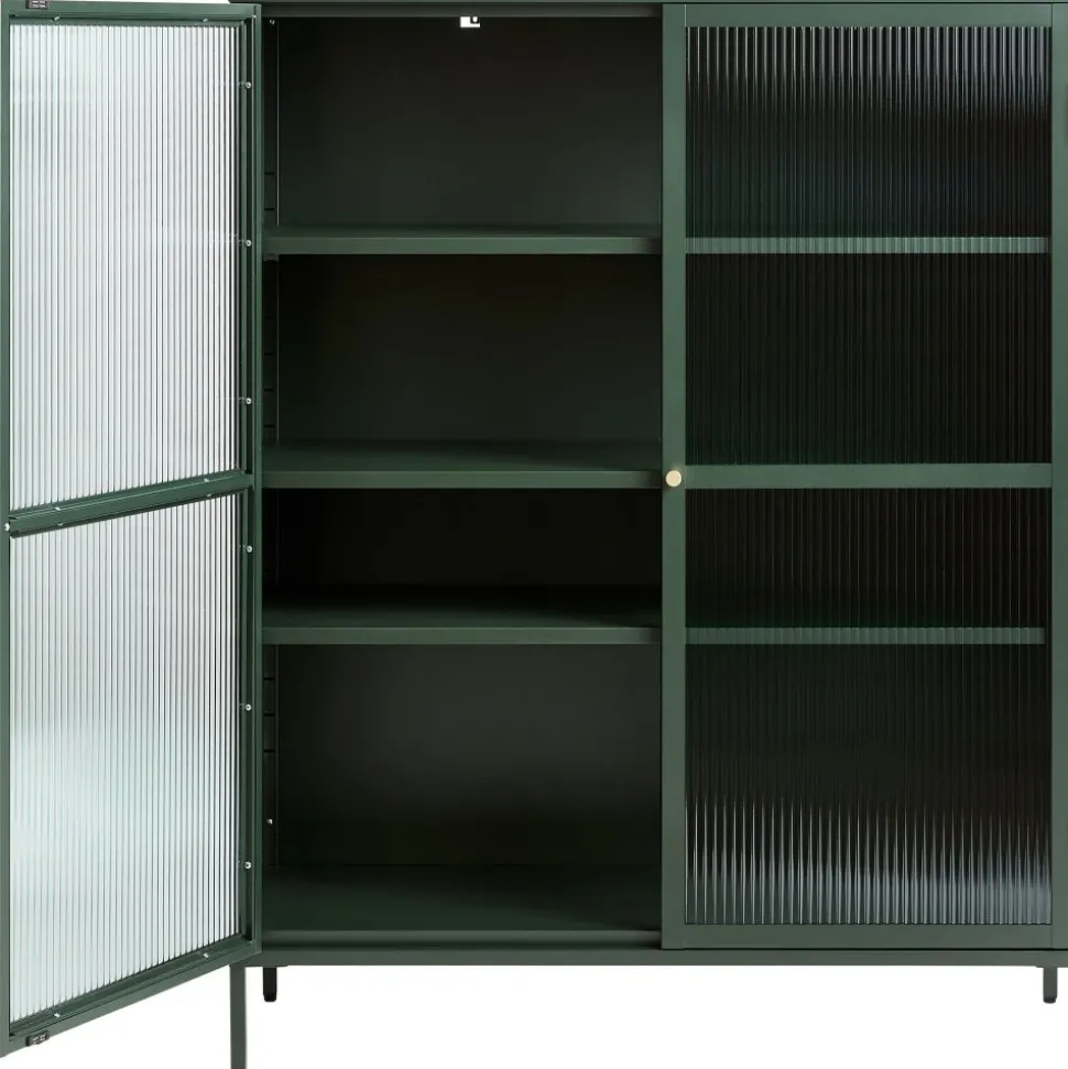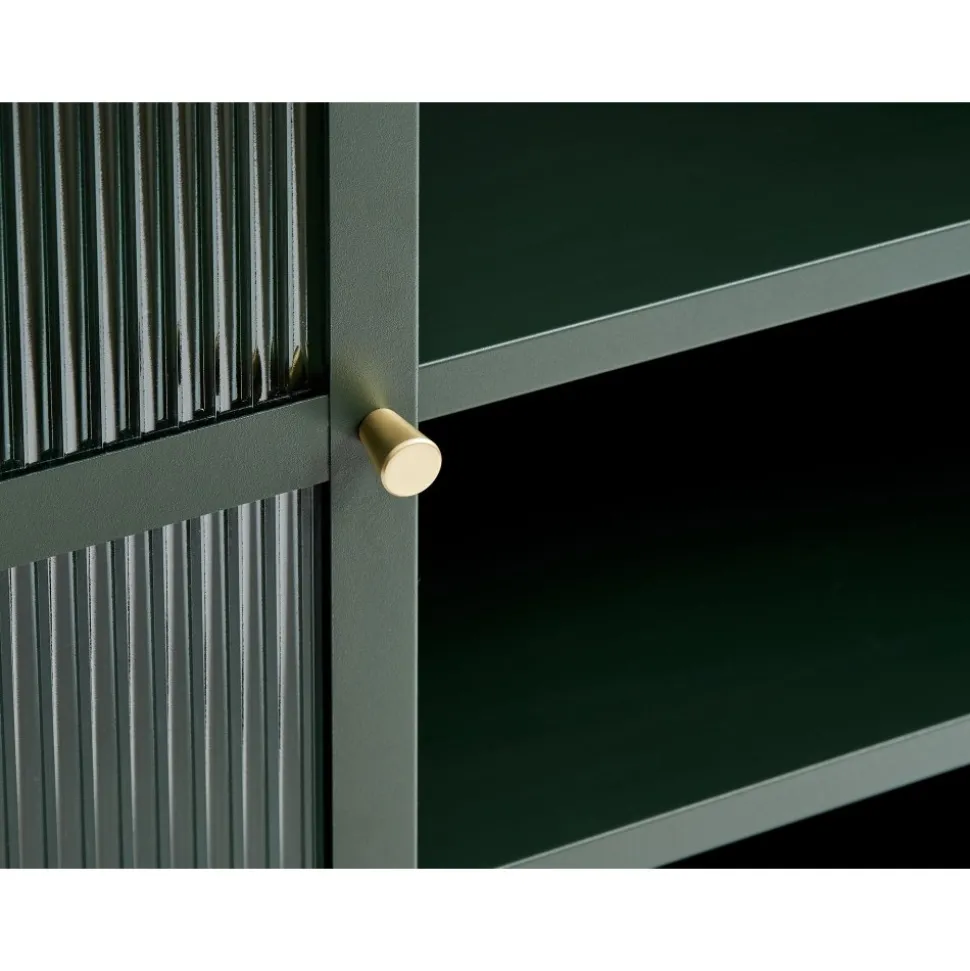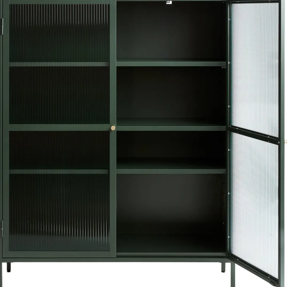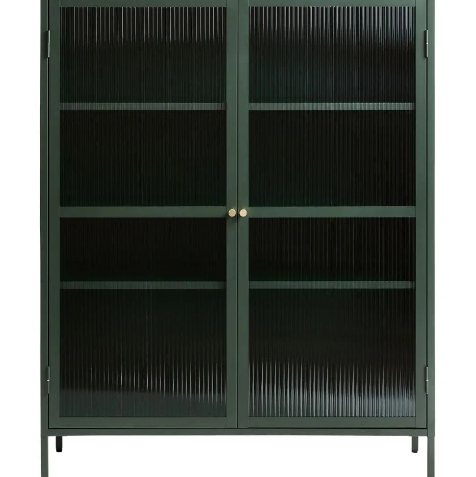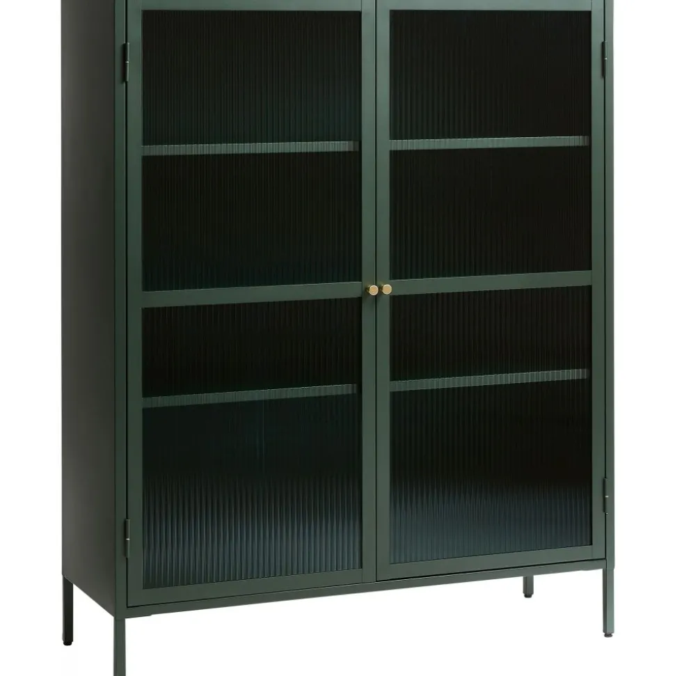 Dobb mörkgrönt metallskåp med dörrar i riktigt linjerat glas. Handtag i mässing. Skåpet har en stabil konstruktion i metall.