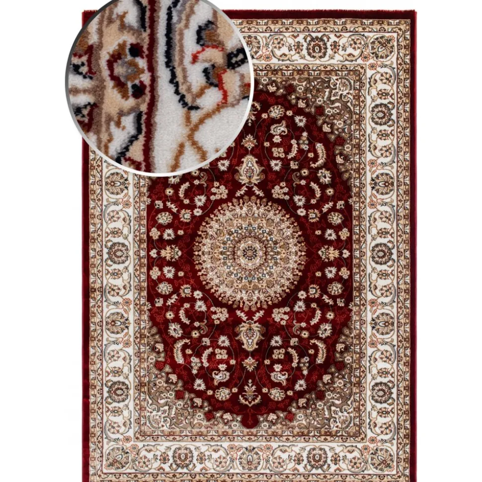 Dubai Medallion Röd är en vacker med rubinröd botten. Mattan har ett klassiskt orientaliskt medaljongmönster i creme med inslag av blått, vitt och natur. Runt om går en matchande bård och kanten har en langett med den vackra rubinröda färgen. Dubai har en fin lyster och finns i flertal storlekar och längder.