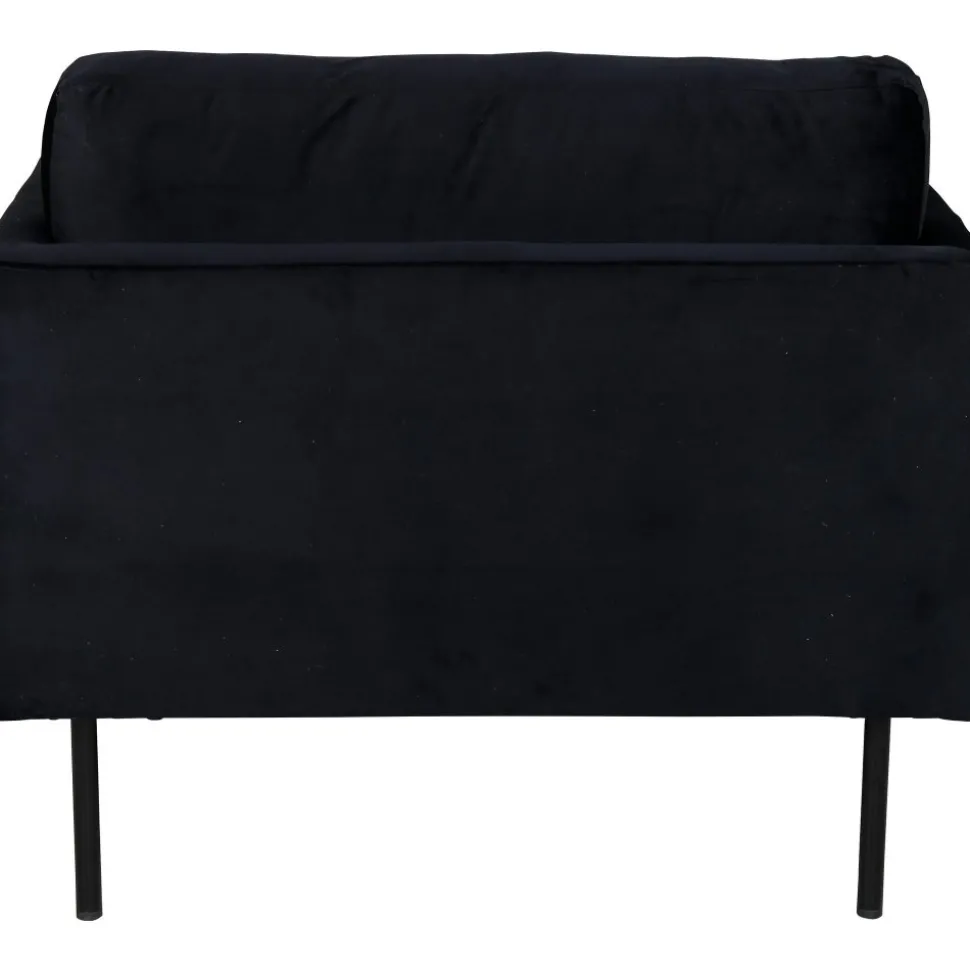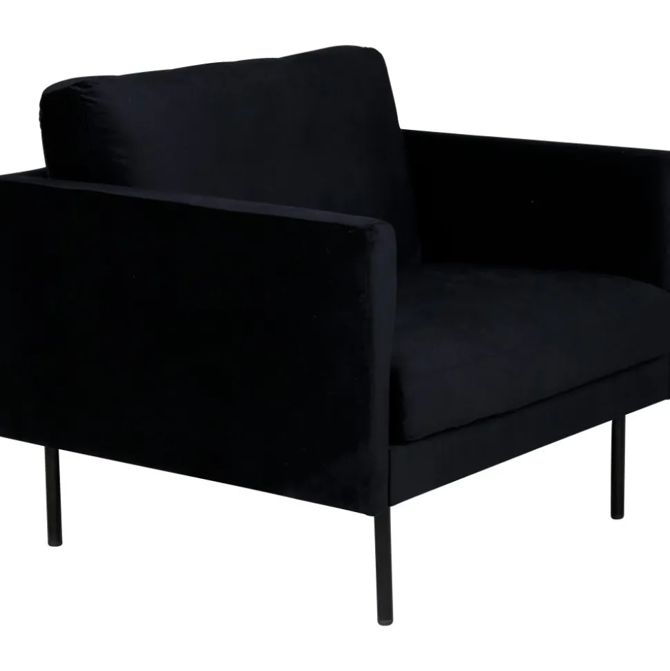 Fåtölj av metall och återvunnet trä, klädd med polyestertyg.