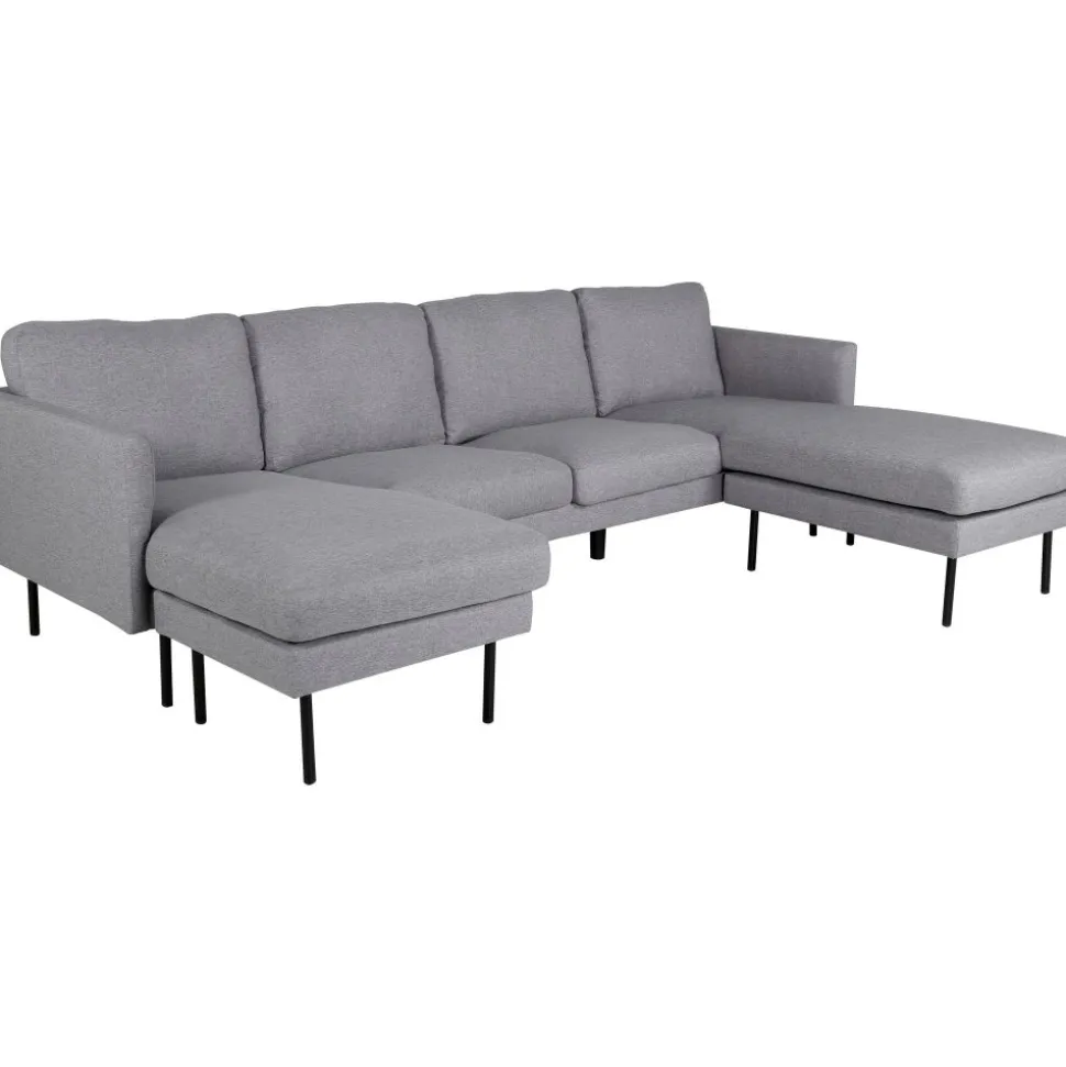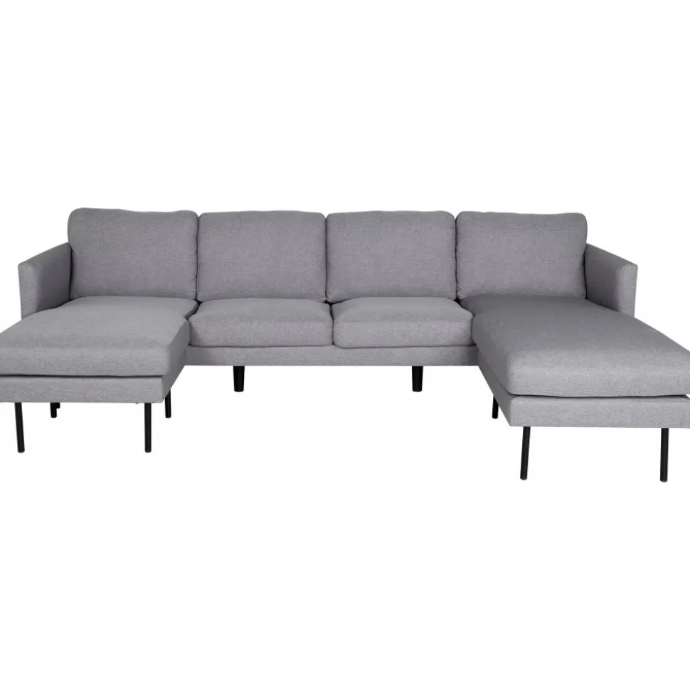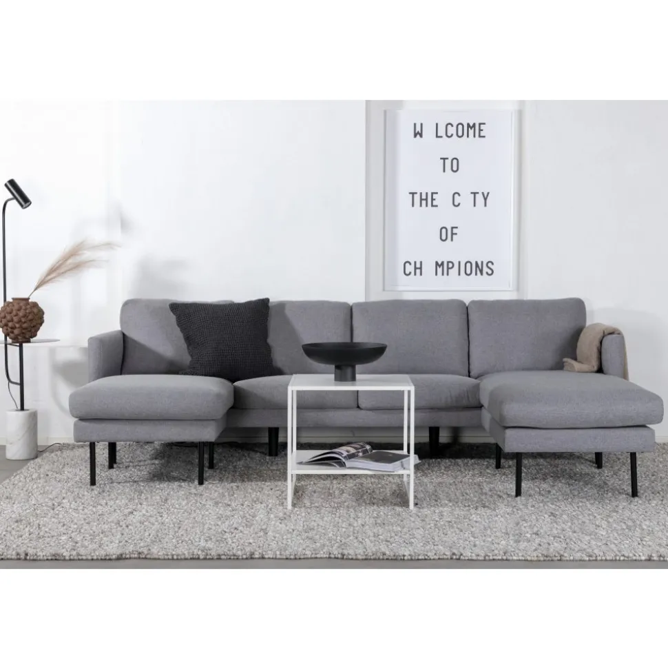U-soffa av trä och metall, klädd med polyestertyg.