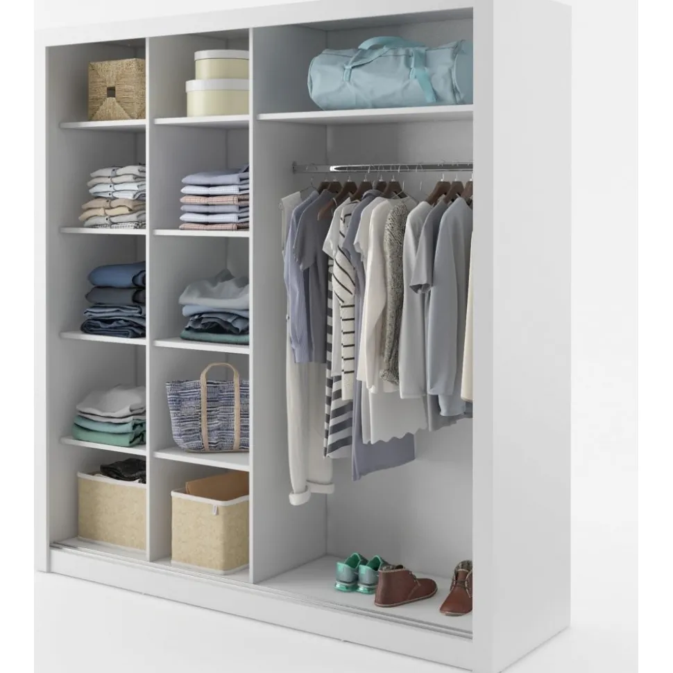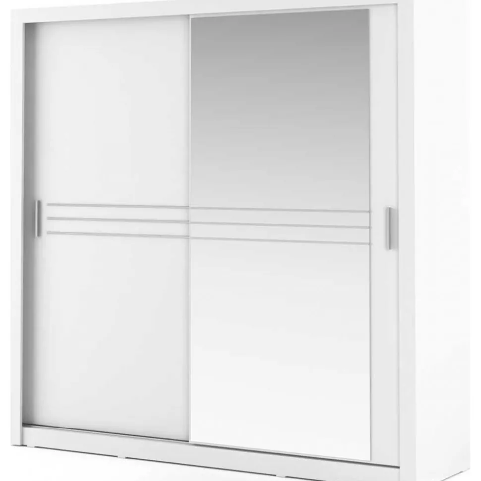 Garderob av trä med skjutdörrar. Den yttersta dörren har en helkroppsspegel. Handtag av plast med matt finish. Levereras omonterad.