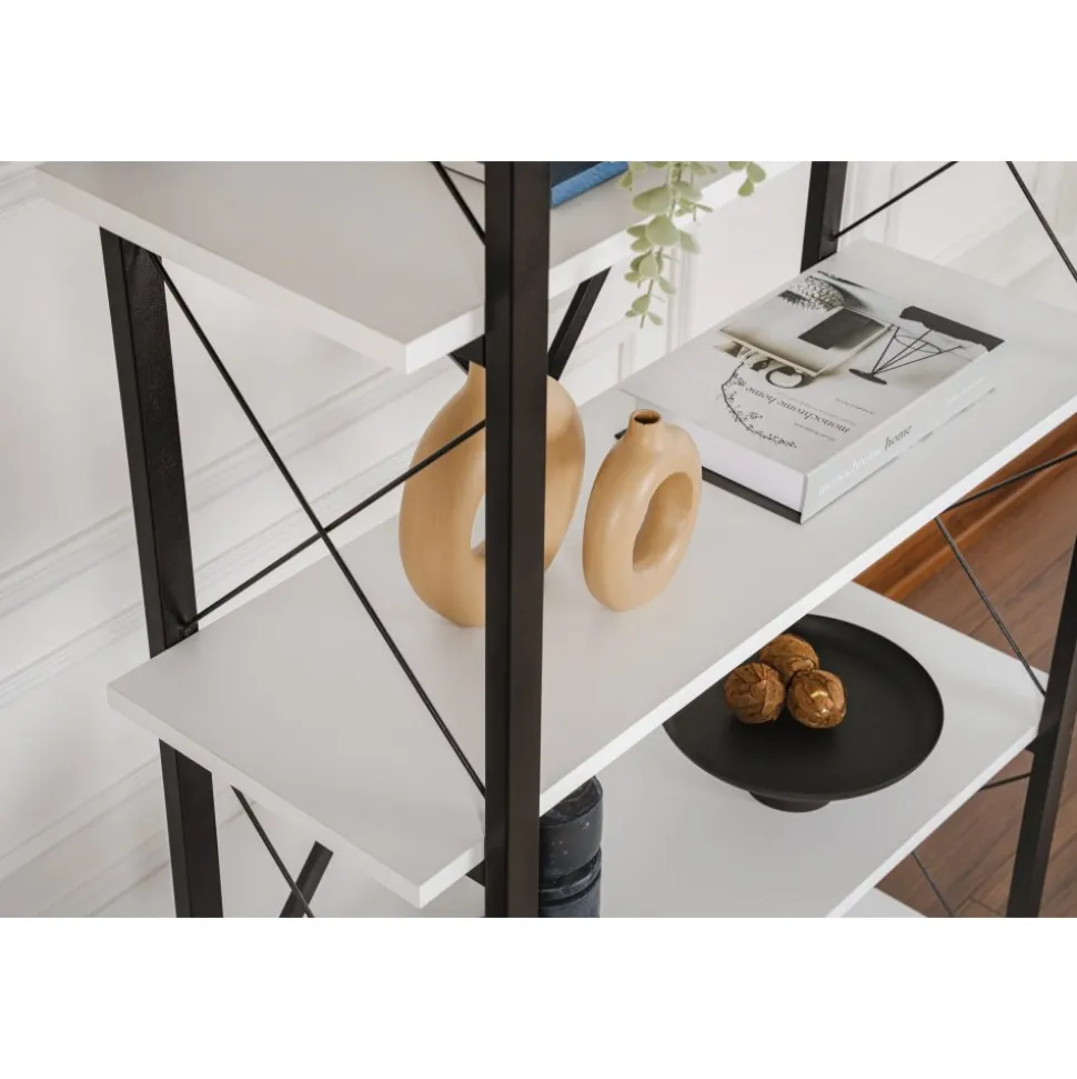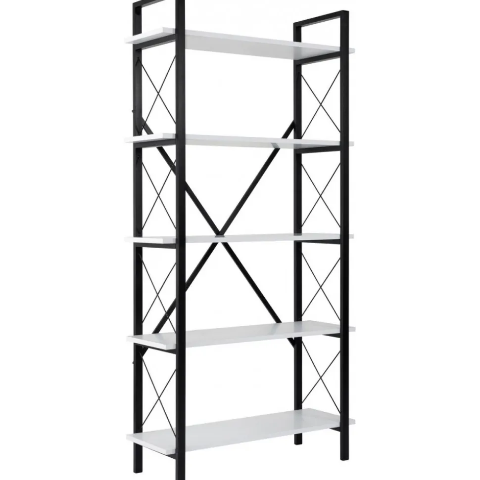 Bokhylla av melaminbelagd spånskiva och metall.