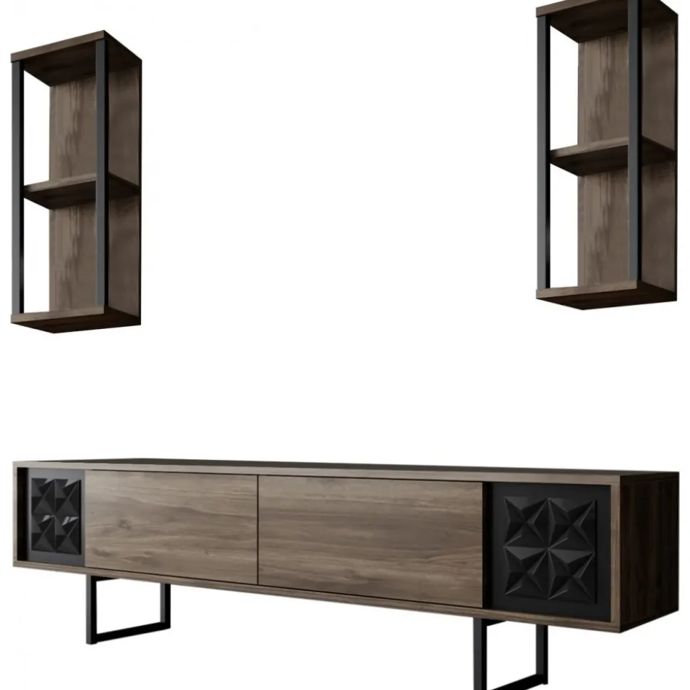 Mediabänk och vägghyllor av melaminbelagd spånskiva med ben av metall.