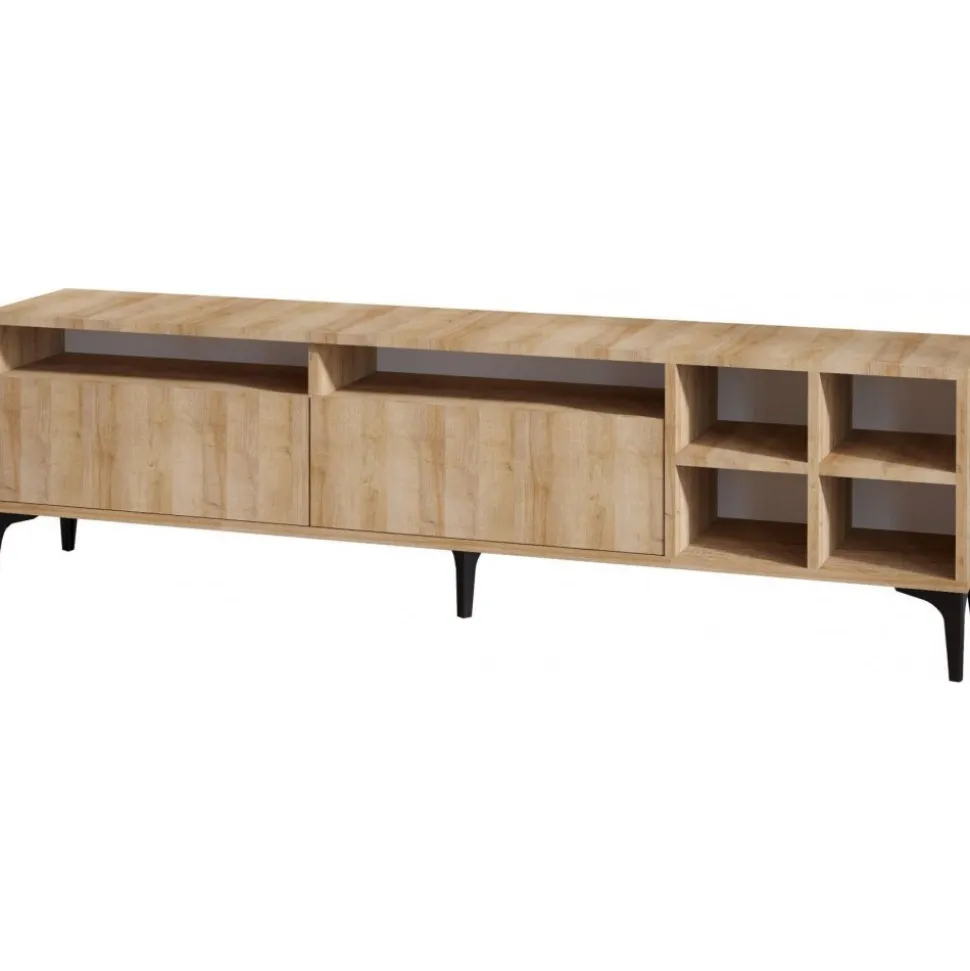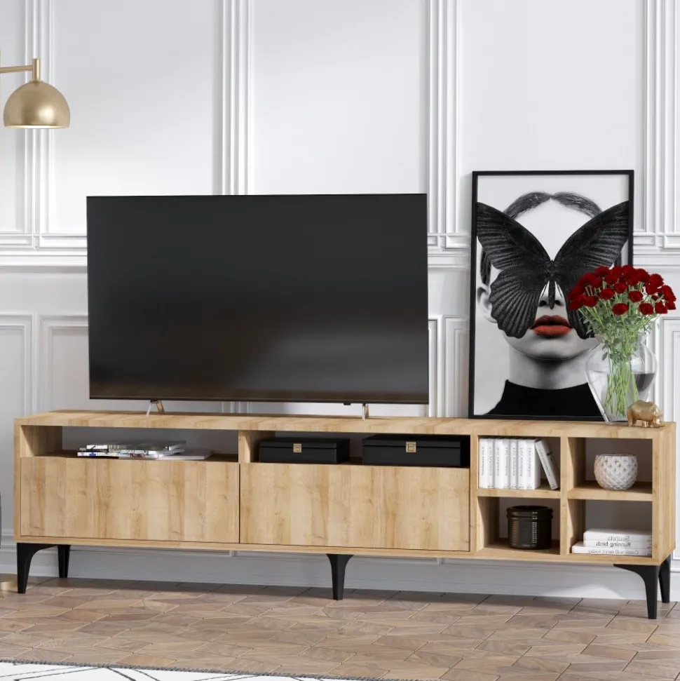 Mediabänk av trä och plast.