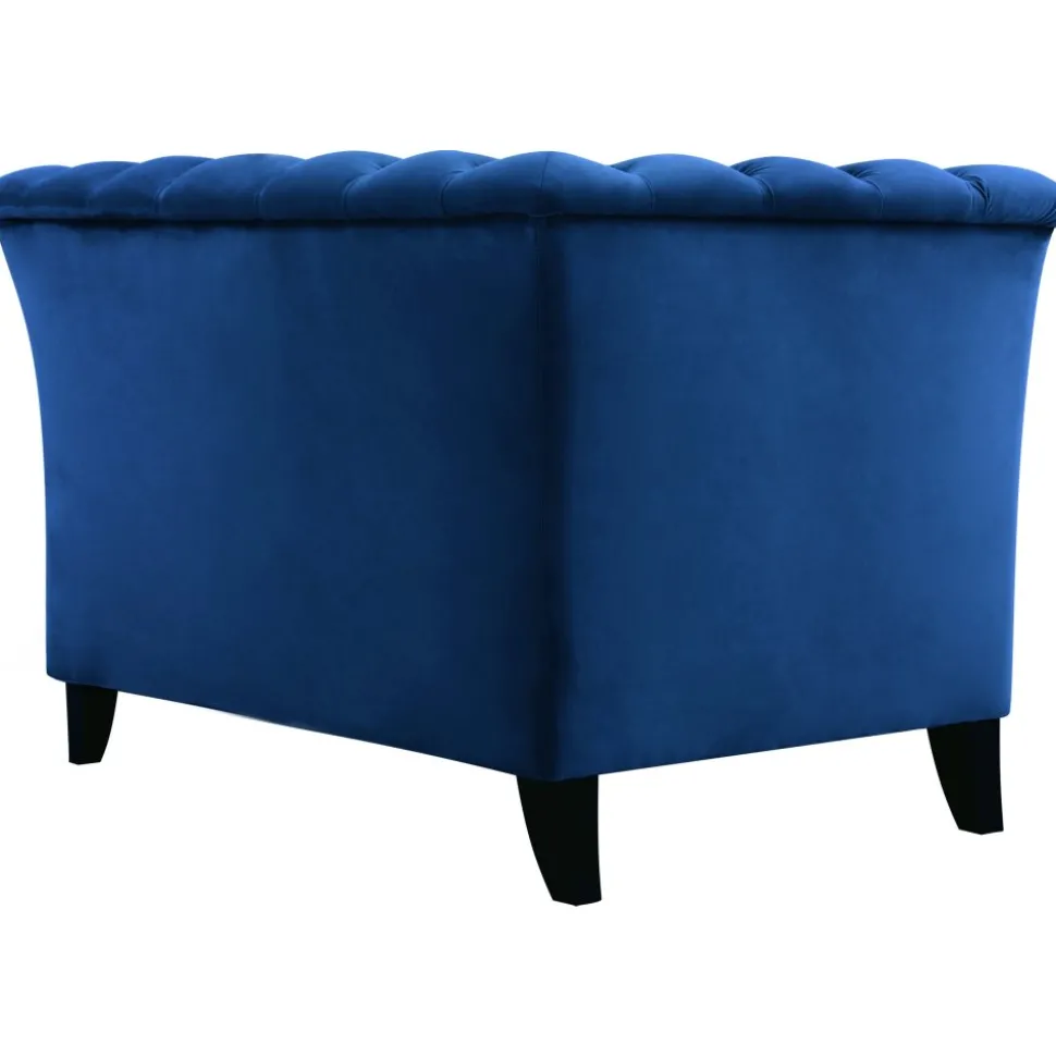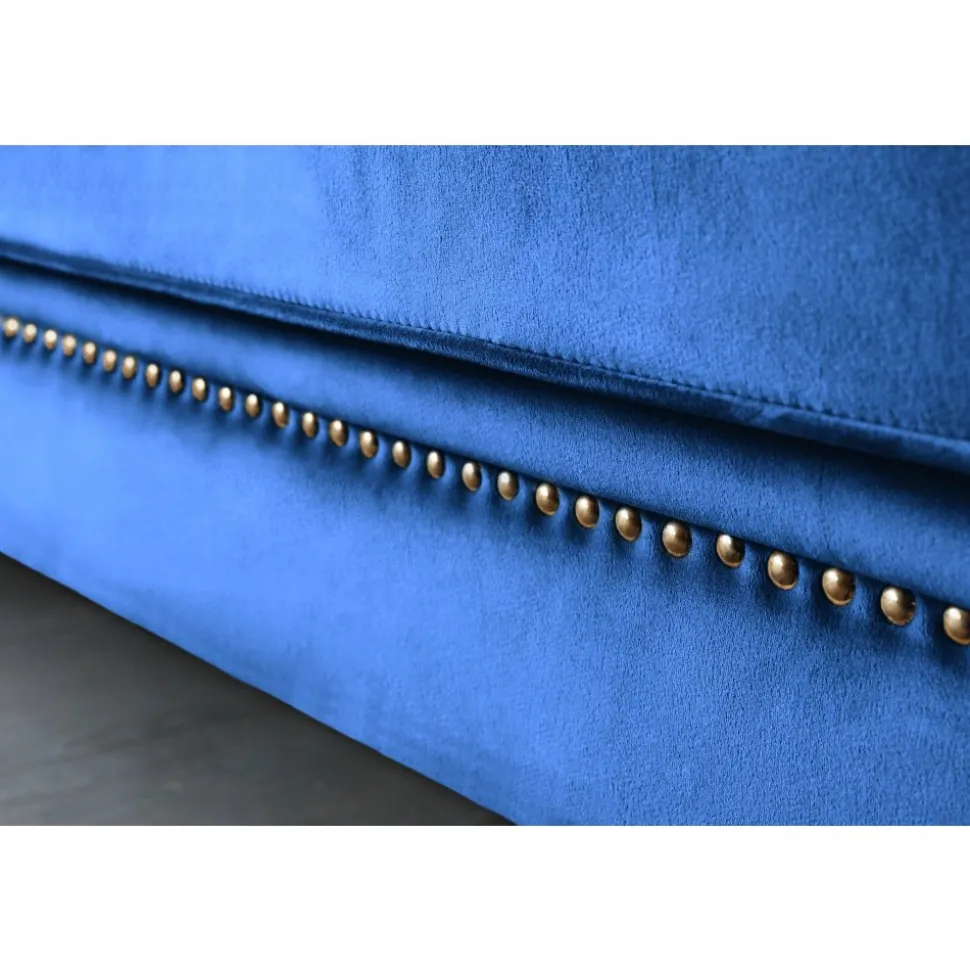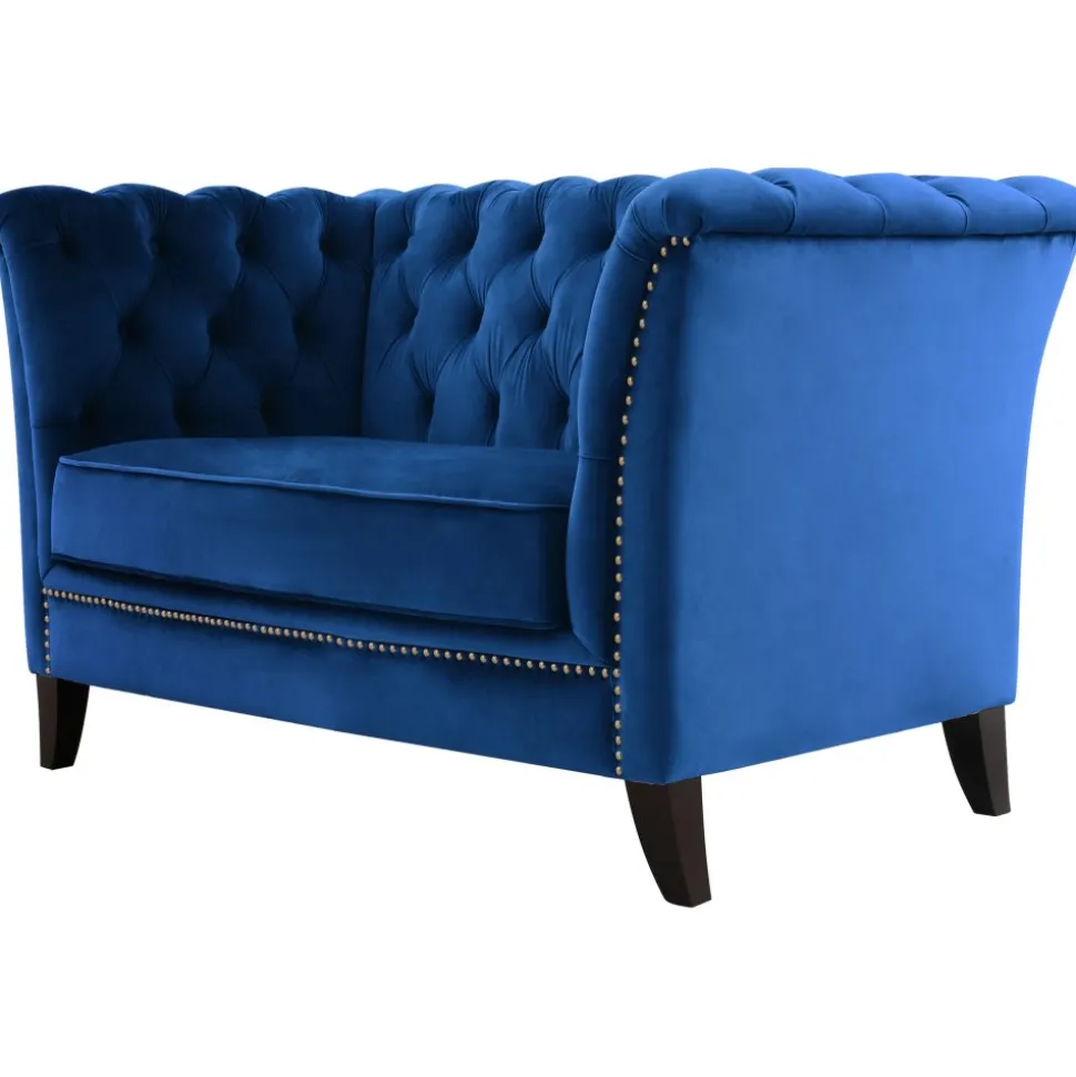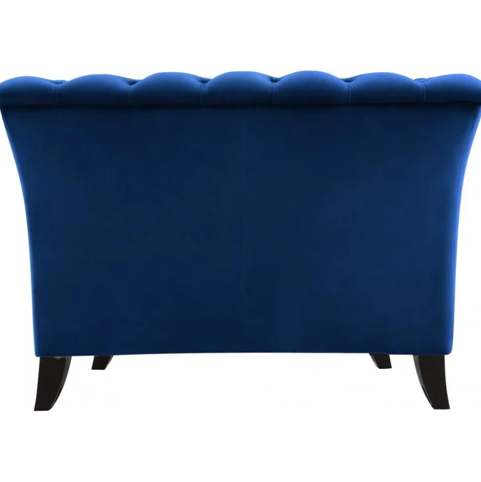 Milton soff- och fåtölj-serie har en klassisk chesterfield design med en slankare formgivning. En stilren artdeco i ett mjukt sammetsliknande tyg, blå sammet. Svarta matchande träben.