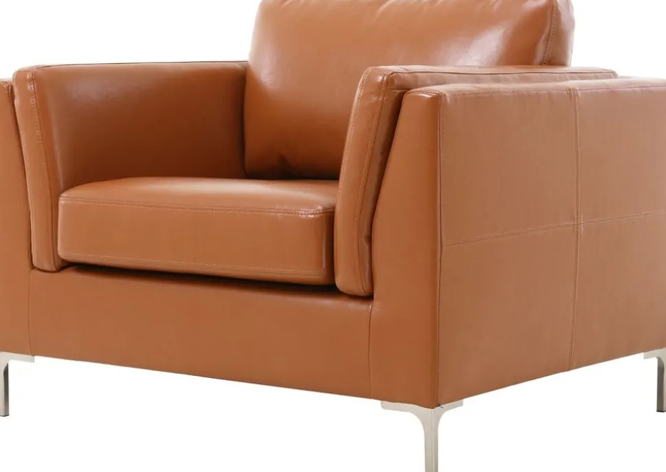 Fåtölj klädd i cognacsfärgat konstläder med fötter i metall. Konstlädret är tillverkat för att ge en känsla och ett utseende av riktigt läder men till en låg peng.