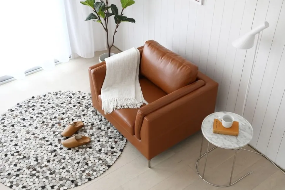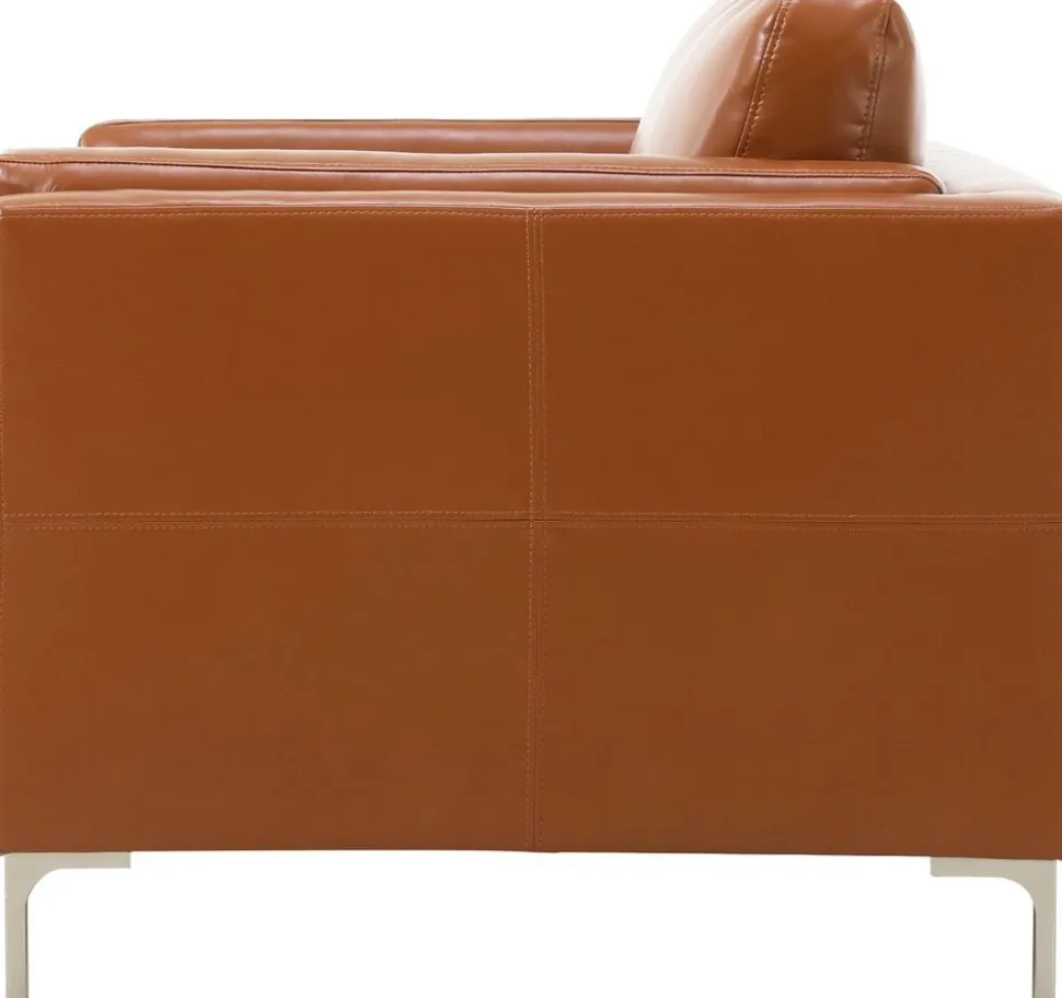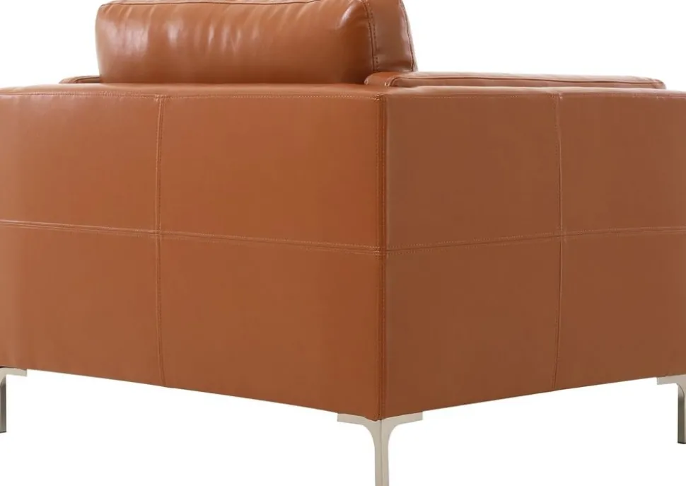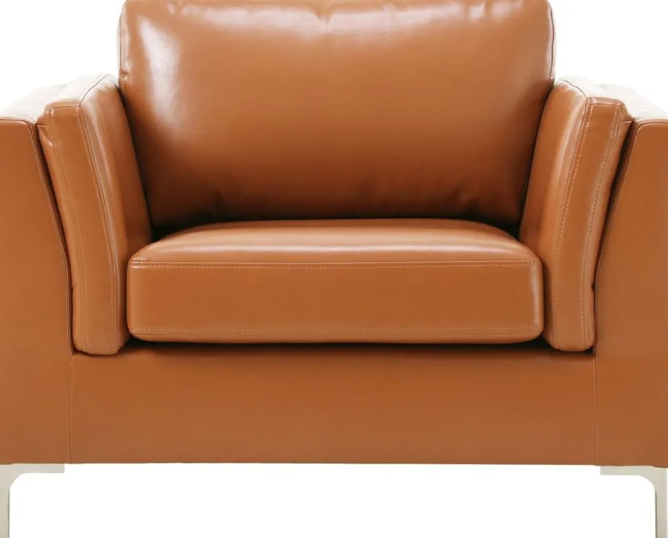 Fåtölj klädd i cognacsfärgat konstläder med fötter i metall. Konstlädret är tillverkat för att ge en känsla och ett utseende av riktigt läder men till en låg peng.