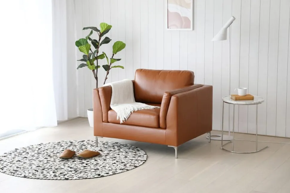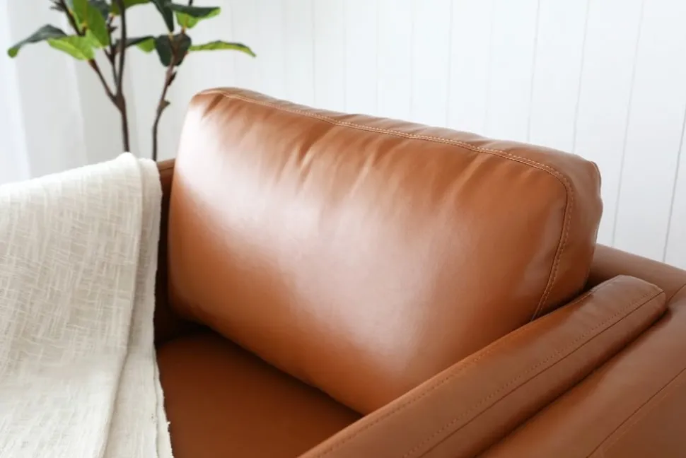 Fåtölj klädd i cognacsfärgat konstläder med fötter i metall. Konstlädret är tillverkat för att ge en känsla och ett utseende av riktigt läder men till en låg peng.