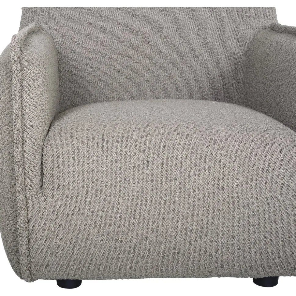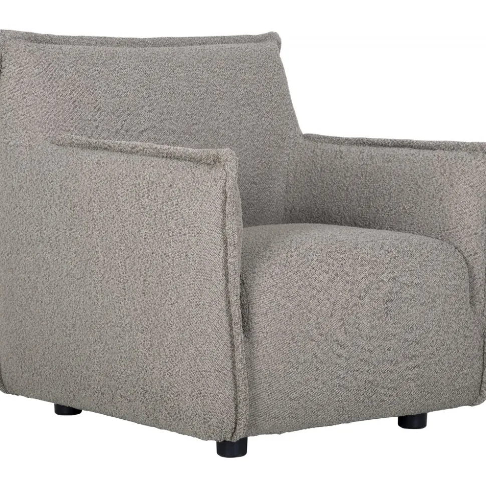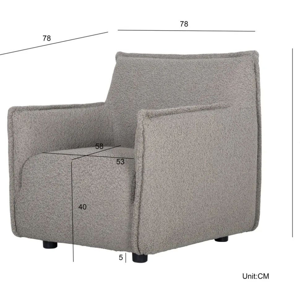 Trendig med klädsel i gråbrunt bouclè tyg och svarta runda diskreta ben. Fåtöljen blir en accesoar i vardagsrummet. Birka fåtölj kommer helt monterad förutom benen som enkelt skruvas på fåtöljen.