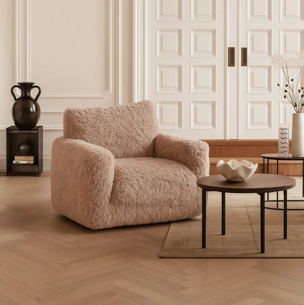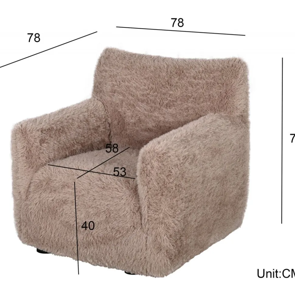 Trendig med klädsel av fluffigt tyg och svarta runda diskreta ben. fåtöljen blir en häftig accesoar i vardagsrummet. Fluffy fåtölj kommer helt monterad förutom benen som enkelt skruvas på fåtöljen.