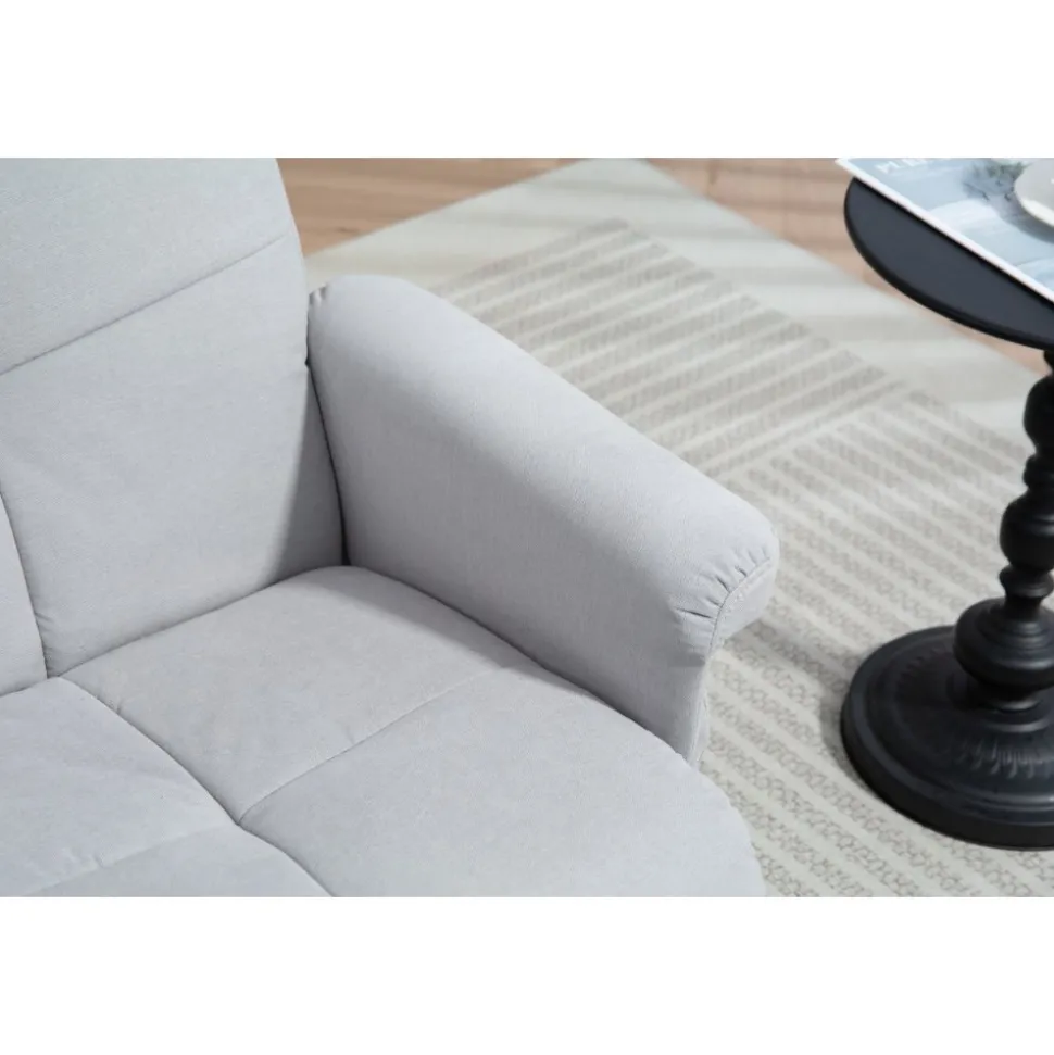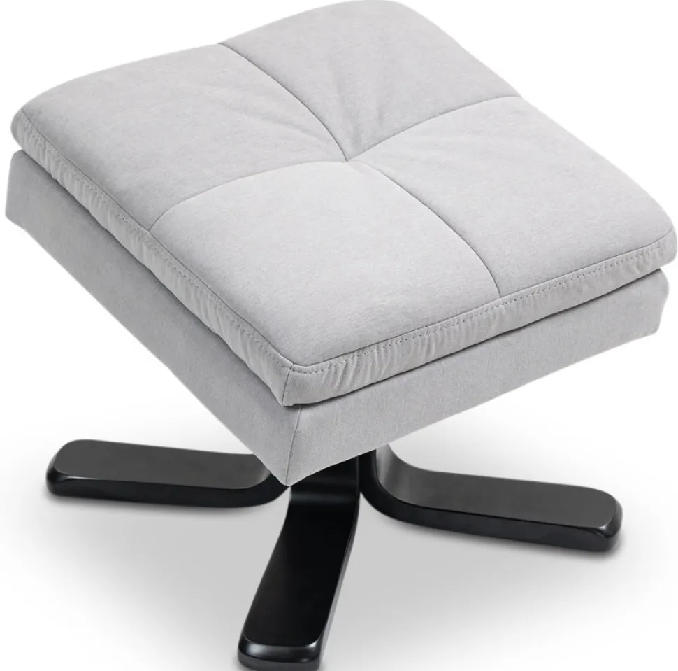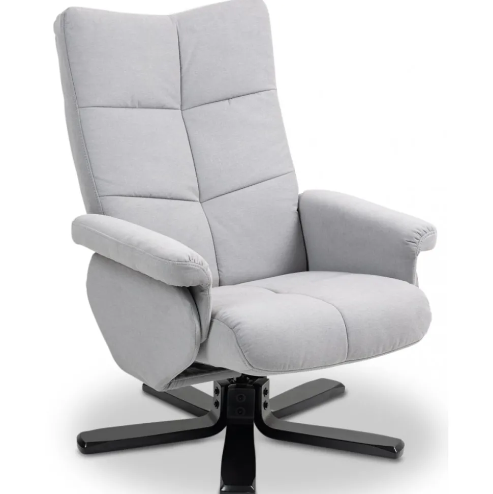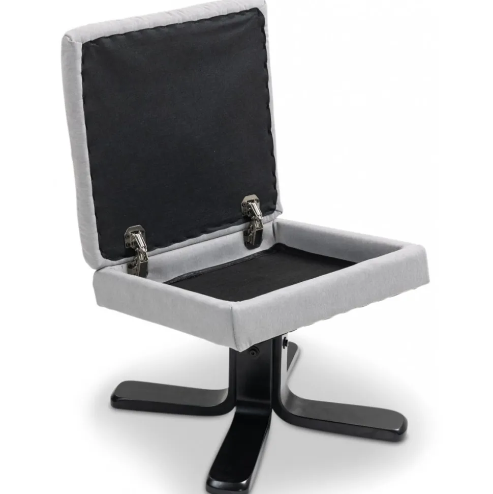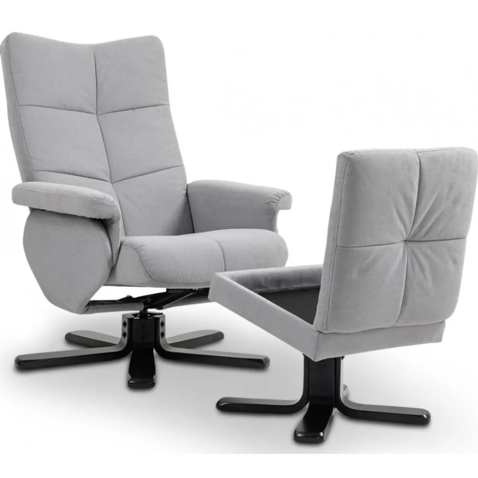 Duva och fotpall med förvaringsdel i fotpallen. Både och fotpall är klädda i slitstarkt skönt grått tyg. Snurrbart underrede till fåtöljen. Fåtöljen är även ställbar för att ge användaren sin favorit position.
